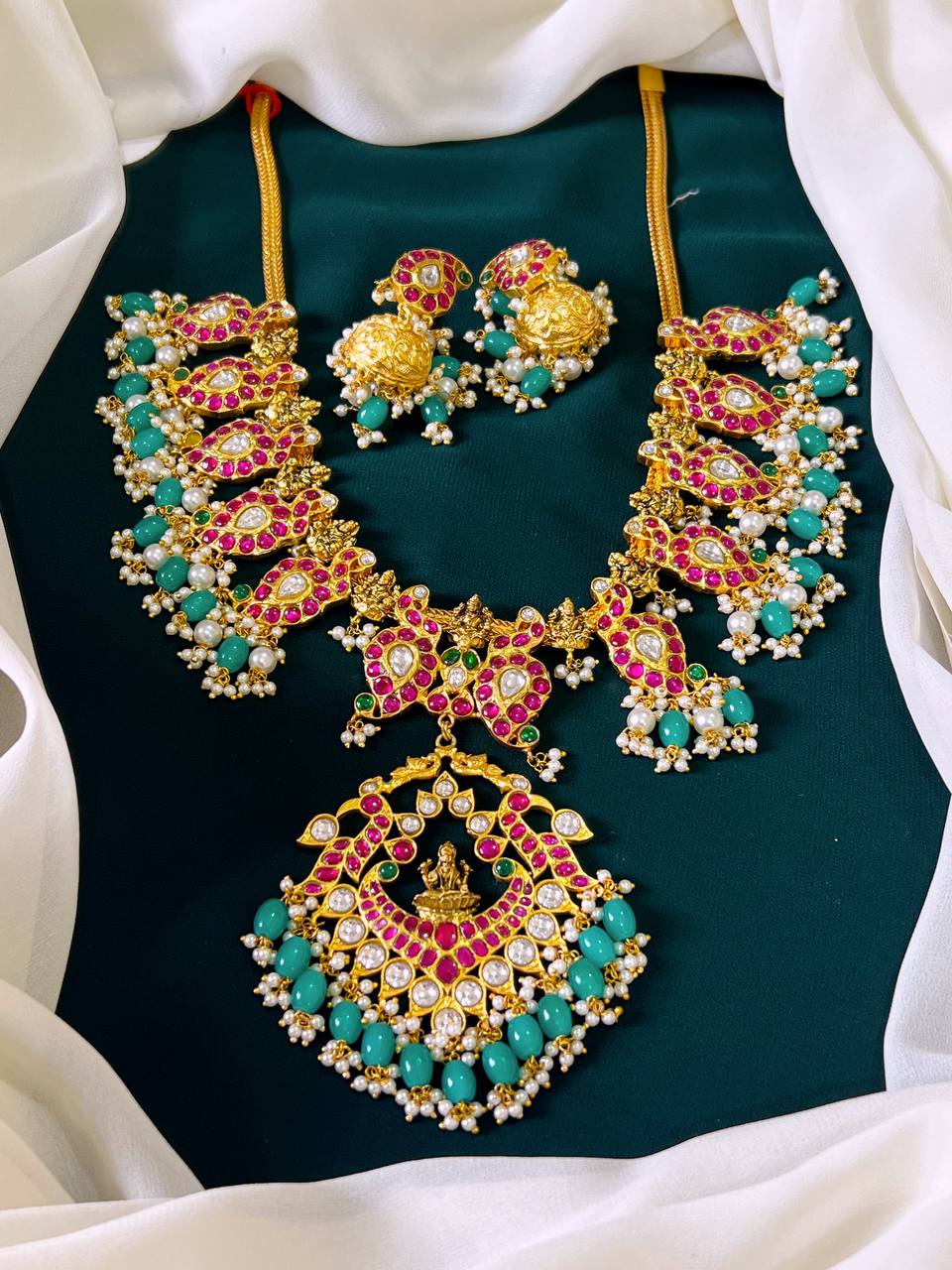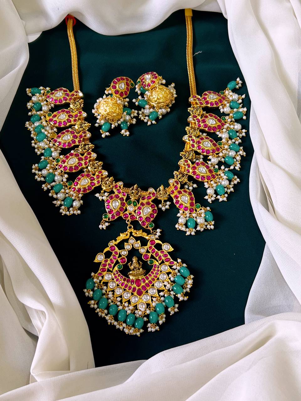 Elevate your accessory collection with this exquisite Mango Necklace with Lakshmi pendent in Jadau Kundan with Earring adorned with intricate JADAV KUNDAN workmanship. This stunning piece combines elegance and tradition, making it a perfect addition to any outfit, whether for a special occasion or everyday wear.