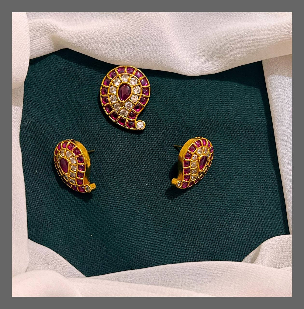 Celebrate timeless elegance with this exquisite Mango Pendant and Earring set. Inspired by nature's most beloved fruit, each piece features intricate detailing that captures the graceful curves and vibrant essence of a mango. The pendant serves as a stunning focal point, while the matching earrings complete your coordinated look with effortless sophistication. Crafted with care, this set brings warmth and charm to any occasion, whether you're dressing up for a special event or adding a touch of cultural beauty to your everyday style. A perfect choice for those who appreciate meaningful, artfully designed jewelry.