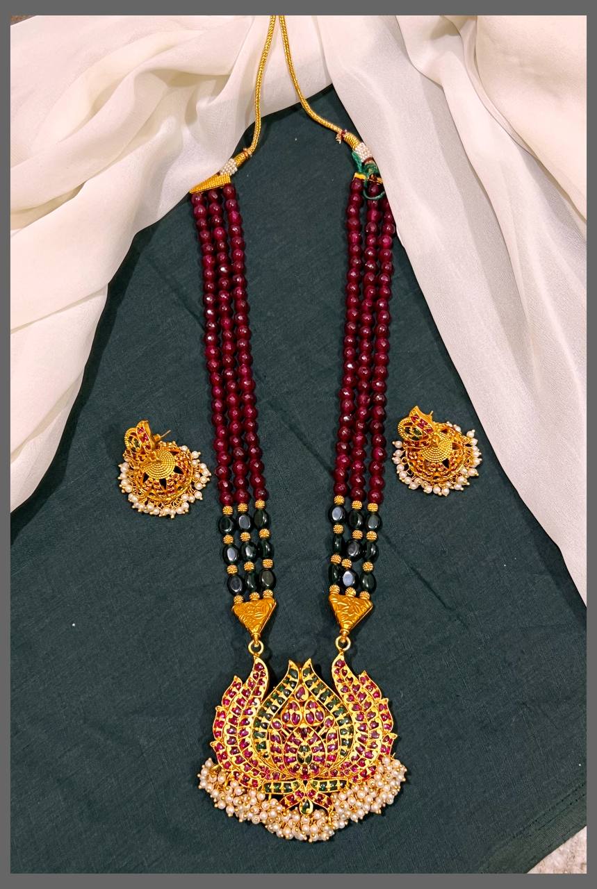 Elevate your traditional look with this stunning Marron and Green Haram featuring an elegant pendant. The rich maroon tones blend beautifully with vibrant green accents, creating a sophisticated color palette perfect for festive occasions and celebrations. The attached pendant adds an extra touch of grace and refinement to this classic piece. Crafted with attention to detail, this haram complements both sarees and traditional ensembles effortlessly. A versatile addition to your jewelry collection that brings timeless elegance to every wear.