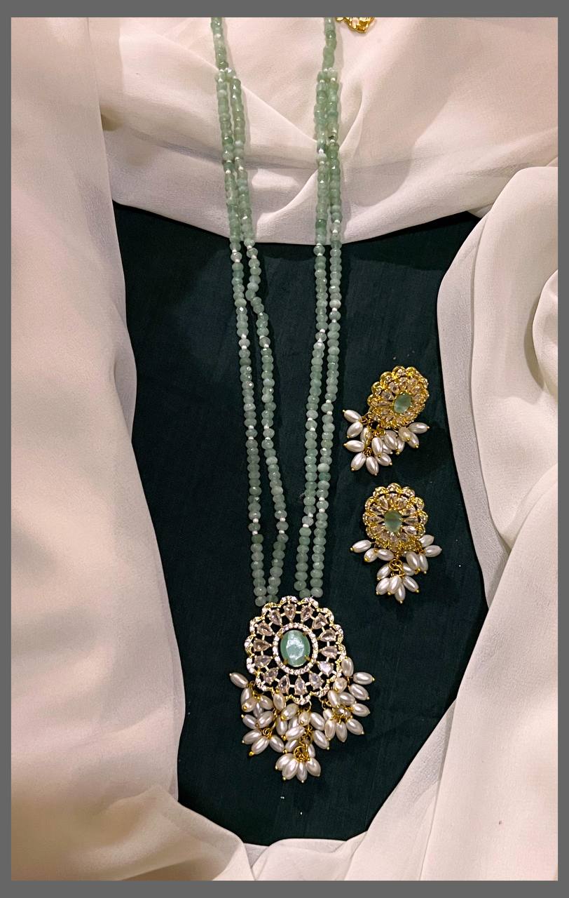 Elevate your traditional wardrobe with this exquisite Mint and Rice Pearl Haram, beautifully paired with an ornate Victorian pendant. The delicate rice pearls in soft mint tones create an understated elegance, while the intricately designed Victorian pendant adds a touch of vintage sophistication. Perfect for festive occasions, weddings, or special celebrations, this piece seamlessly blends classic charm with contemporary style. The harmonious combination of pearls and pendant craftsmanship makes it an ideal choice for those who appreciate timeless jewelry that tells a story. Wear it with confidence and grace.