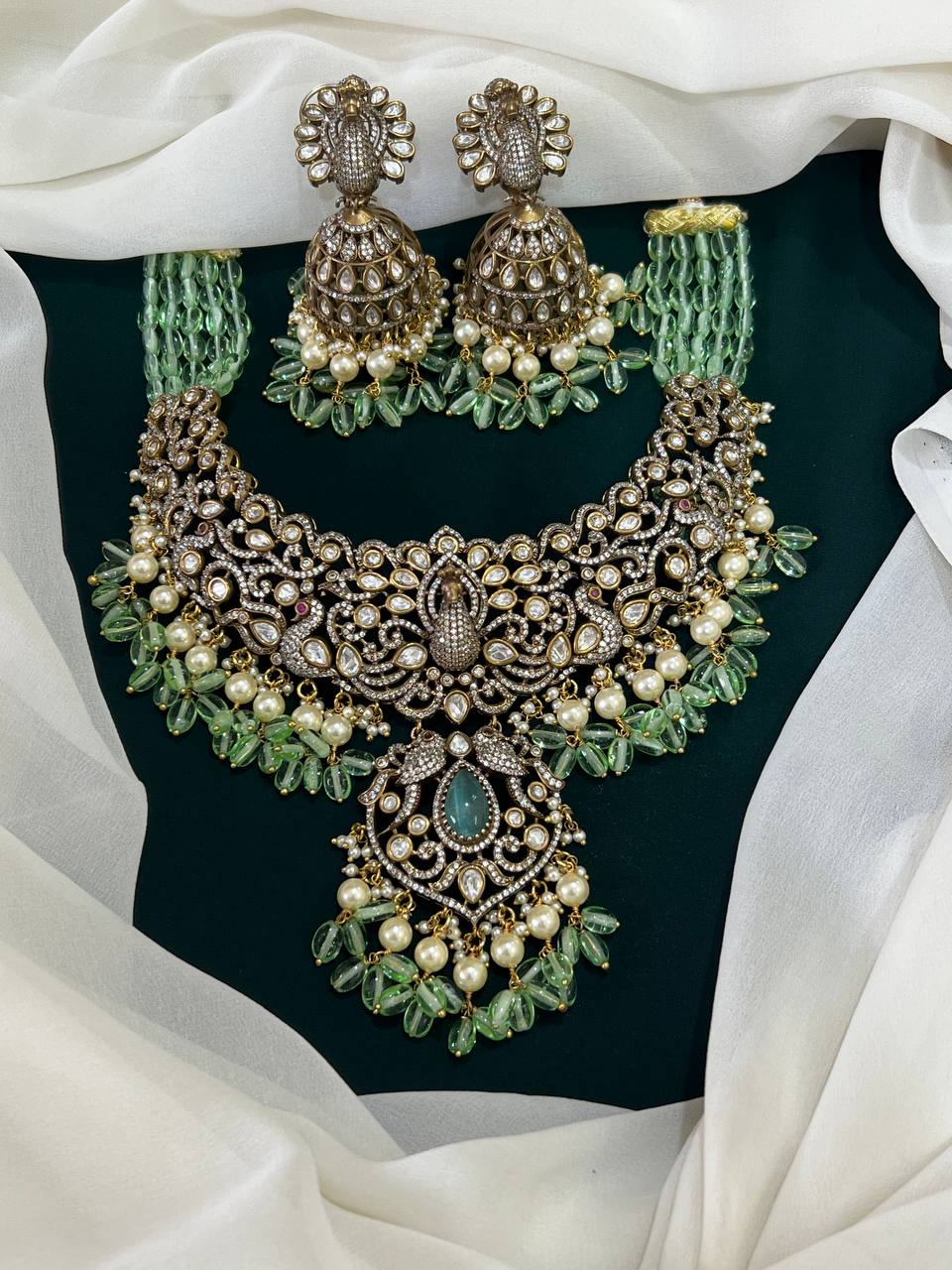 Elevate your style with our Mint Victorian Necklace with Jhumkis - VN0077. This stunning necklace is the perfect accessory for any wedding season. The intricate design and delicate mint color add a touch of elegance to any outfit. Make a statement and stand out with this grand and beautiful piece.