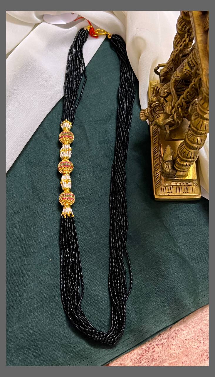 Elevate your traditional look with this stunning Mop Design Haram, where lustrous gold beads meet the timeless elegance of black pearls. Each piece is thoughtfully crafted to create a graceful drape that complements both everyday wear and special occasions. The combination of warm gold tones with deep black pearls offers a sophisticated contrast that works beautifully with any outfit. Perfect for those who appreciate classic jewelry with a modern sensibility, this haram brings together traditional craftsmanship and contemporary style. A versatile addition to your collection that celebrates your refined taste in jewelry.