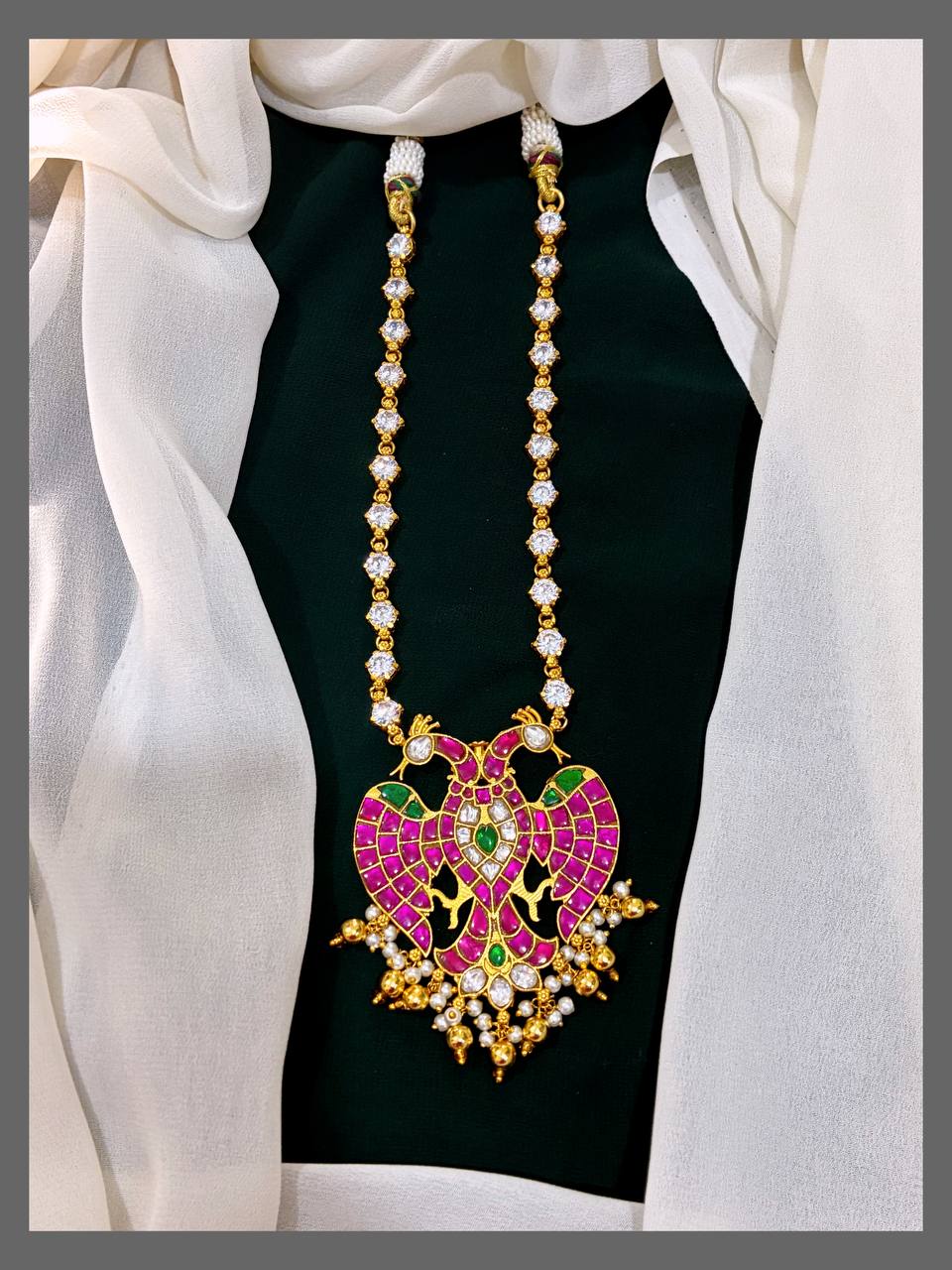 Indulge in the beauty of this Mozonite Gandaberunda Kundan Pendant - KH00176. With its intricate design and shimmering stones, it is a stunning addition to any jewelry collection. Made with the highest quality Mozonite, this pendant exudes elegance and sophistication. Elevate your style with this one-of-a-kind piece.