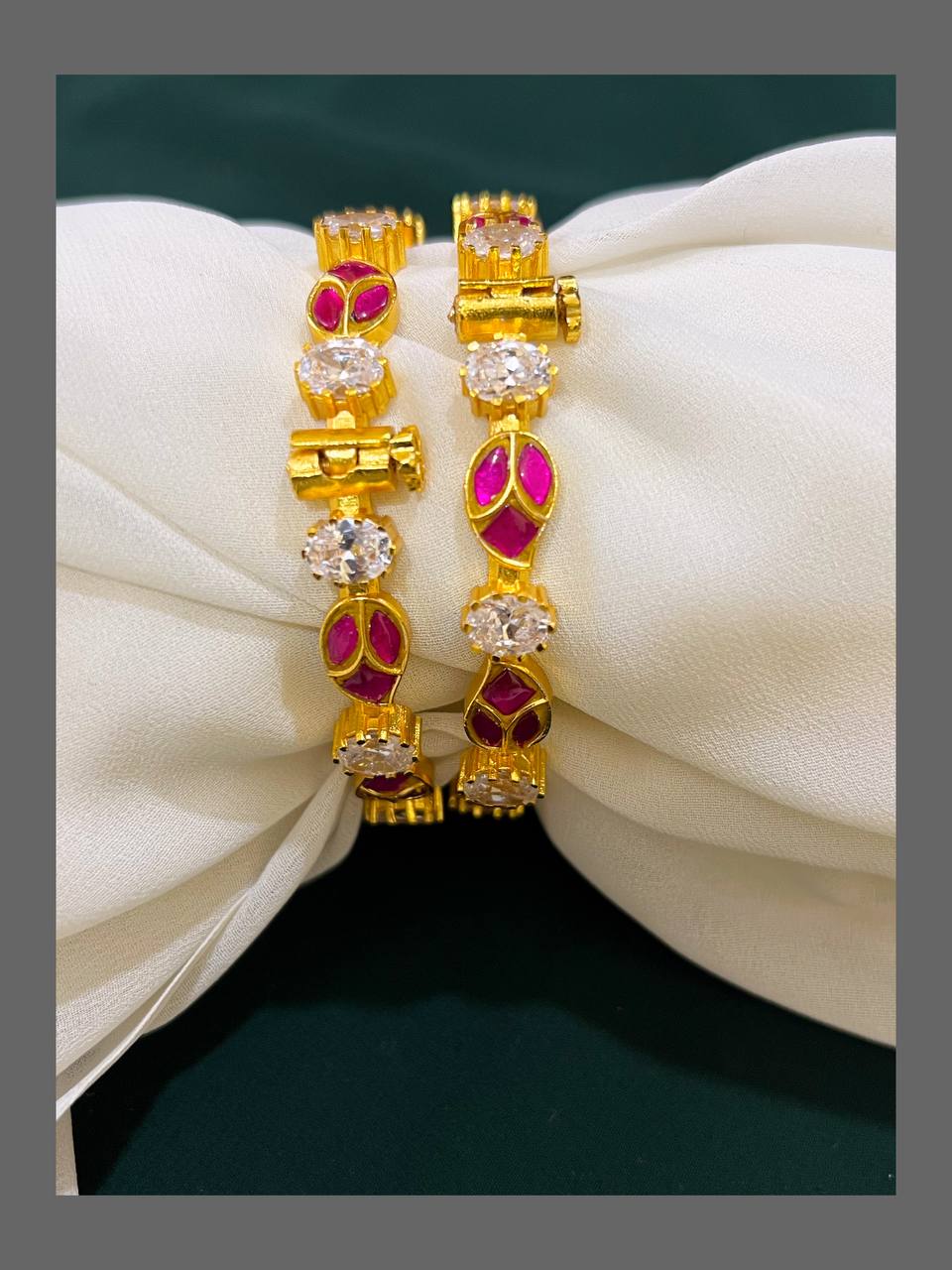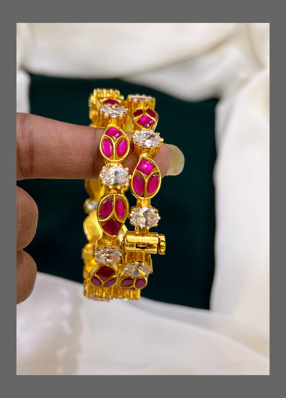 These Mozonite Jadau Leaf Pattern Screw Open Bangles combine traditional elegance with secure wearability. Featuring intricate leaf designs adorned with sparkling mozonite stones, they add a refined touch to any outfit. The screw-open mechanism ensures a comfortable fit and easy wear, making these bangles both beautiful and practical for daily use or special occasions. Perfect for those who appreciate craftsmanship and style in their jewelry collection.