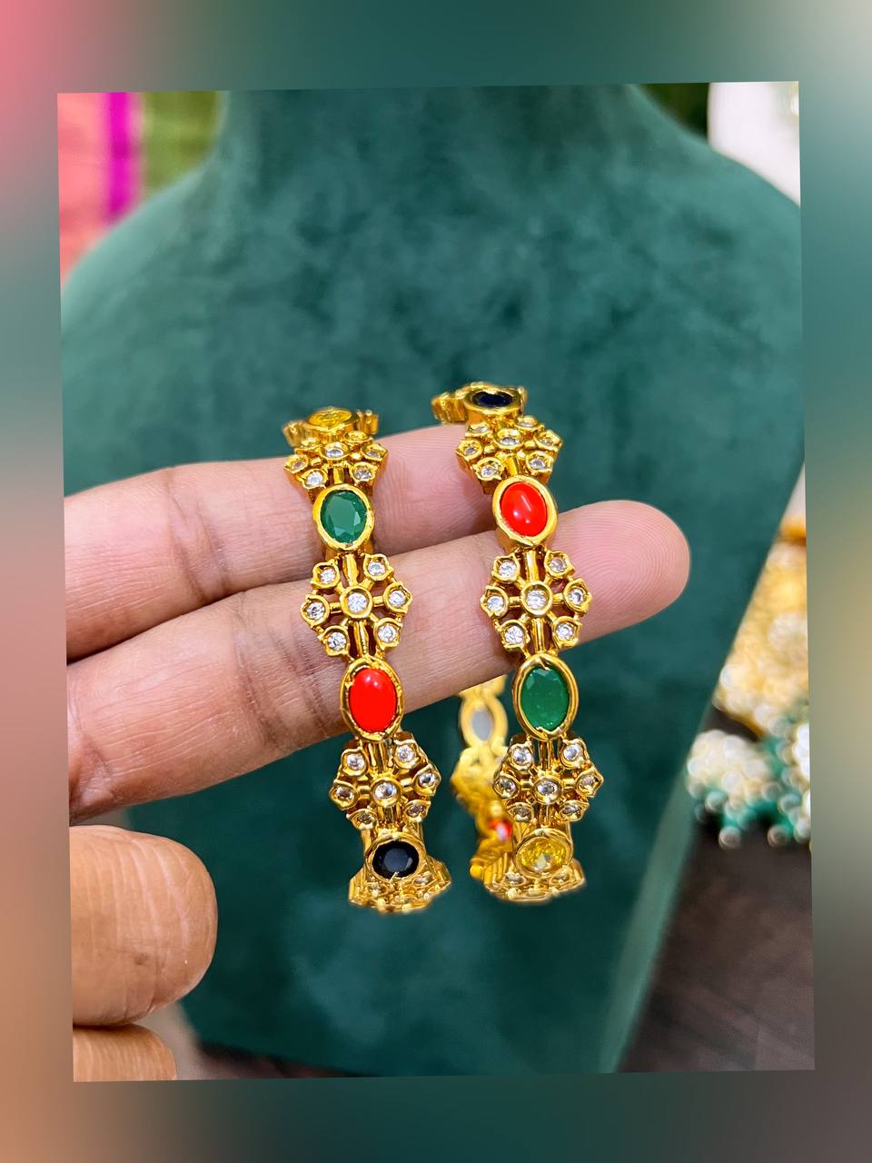These Multi Color navaratna Bangles - BG0018 provide elegant and colorful addition to any outfit. With its beautiful design and high-quality materials, these bangles are perfect for adding a touch of traditional flair to your look. Made with multiple colors of navaratna stones, these bangles make a bold and statement. Elevate your style with these stunning bangles today.