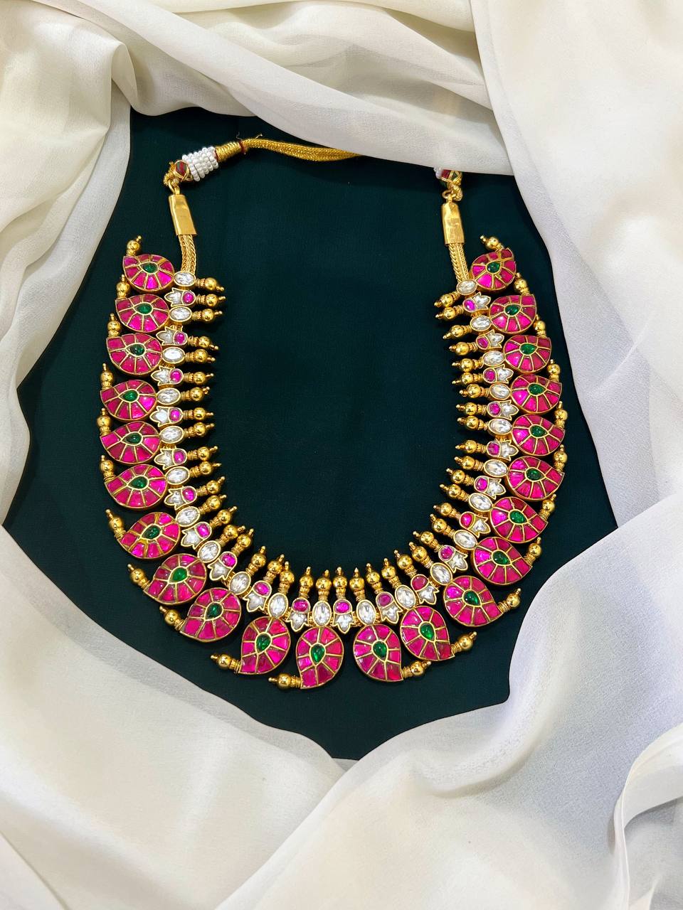 Elevate your accessory collection with this exquisite Multi Color Mango Jadau Kundan Haram adorned with intricate JADAV KUNDAN workmanship. This stunning piece combines elegance and tradition, making it a perfect addition to any outfit, whether for a special occasion or everyday wear.