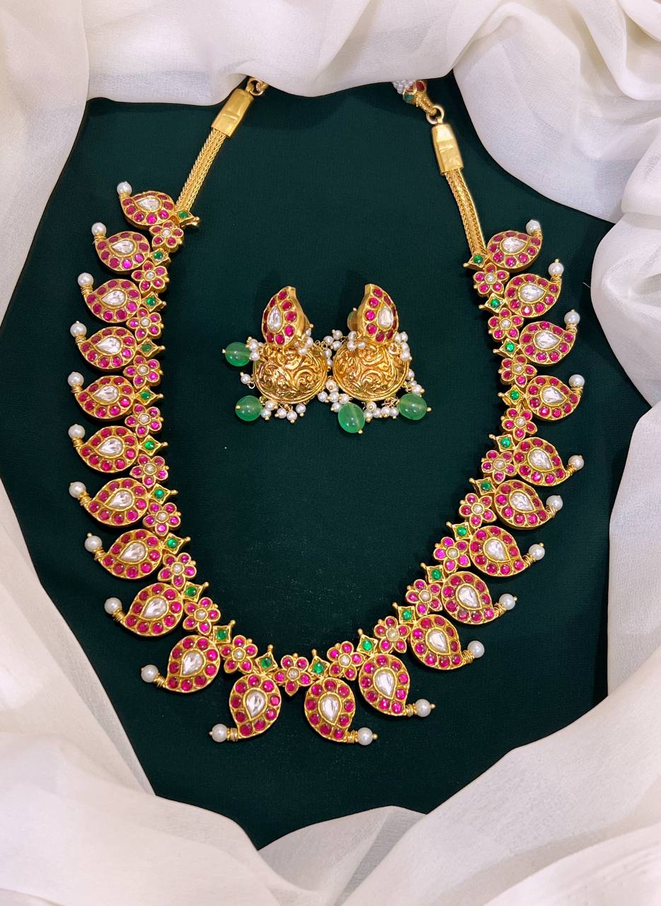 Elevate your accessory collection with this exquisite Beautiful Multi Color Mango Jadau Kundan Haram with Earring adorned with intricate JADAV KUNDAN workmanship. This stunning piece combines elegance and tradition, making it a perfect addition to any outfit, whether for a special occasion or everyday wear.