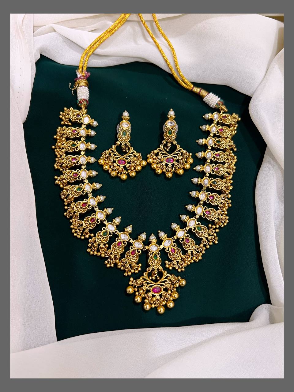This multi-color necklace showcases delicate small golden pearls beautifully arranged in traditional Nakshi craftsmanship. Made from durable brass and adorned with vibrant stones, it adds a touch of elegance to any outfit. Perfect for both everyday wear and special occasions, this necklace combines timeless design with lasting quality to complement your style effortlessly.