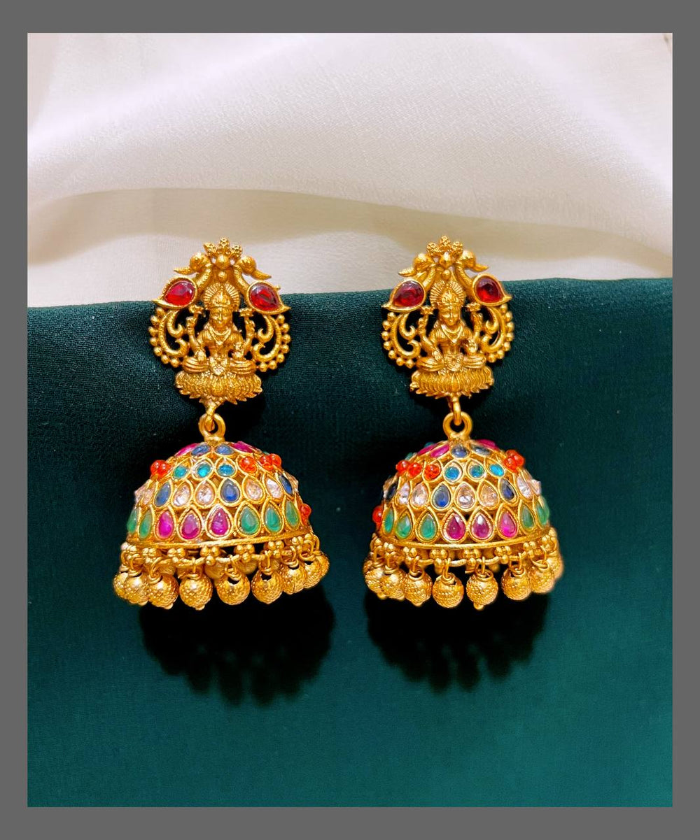 Add a touch of tradition with a playful twist wearing the Multi Lakshmi Jhumki Earrings in Nakshi. These beautifully crafted earrings blend intricate Nakshi designs with vibrant multi-colored accents, making every movement sparkle with charm. Perfect for festive occasions or adding a dash of elegance to your everyday look, they celebrate heritage with a fun, lively spirit.