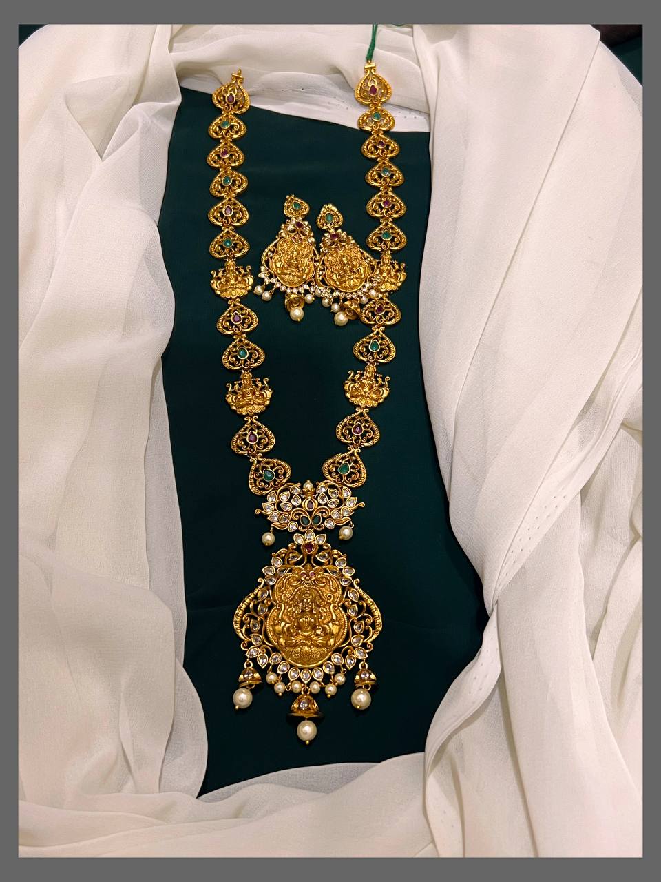 Celebrate tradition with the Multicolour Lakshmi Haram In Nakshi - NN00222. This striking necklace features vibrant colors gracefully woven into intricate Nakshi work, highlighting the auspicious Lakshmi motif. Perfect for enhancing festive and special occasion attire, it brings elegance and cultural charm to your look with comfort and style. A timeless piece to cherish and wear with pride.