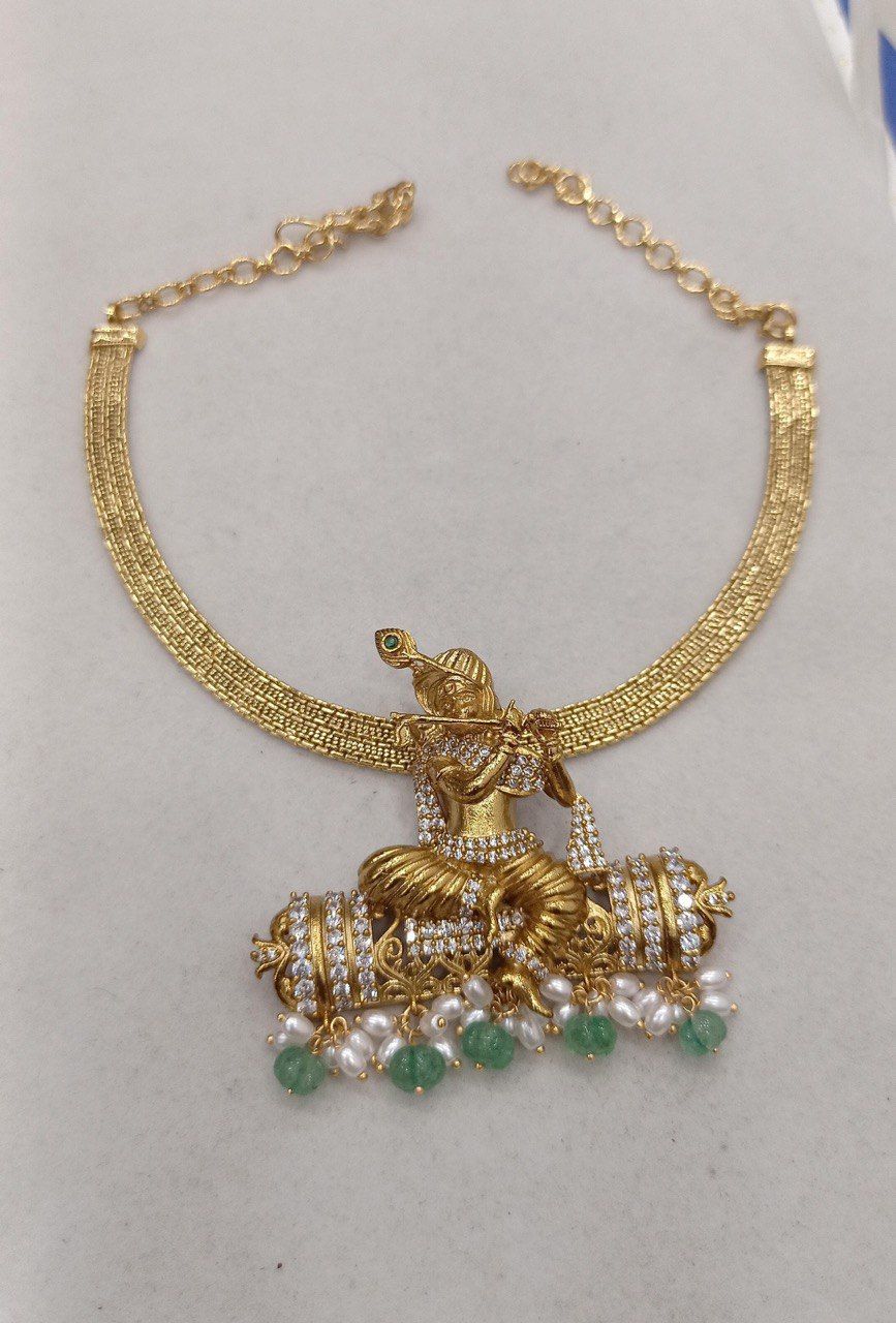 Adorn yourself with this exquisite Nakshi Krishna Pendant paired with a delicate Nanu Chain. The intricate Nakshi workmanship brings Lord Krishna to life in stunning detail, making this pendant a perfect expression of devotion and style. This timeless piece adds a touch of spiritual elegance to any outfit while celebrating India's rich artistic heritage.