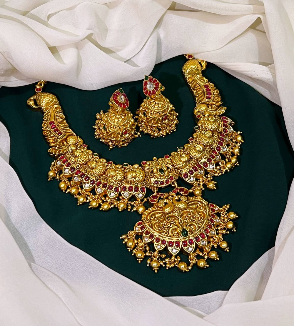 Gold finish Nakshi Peacock necklace with pair of jhumkis