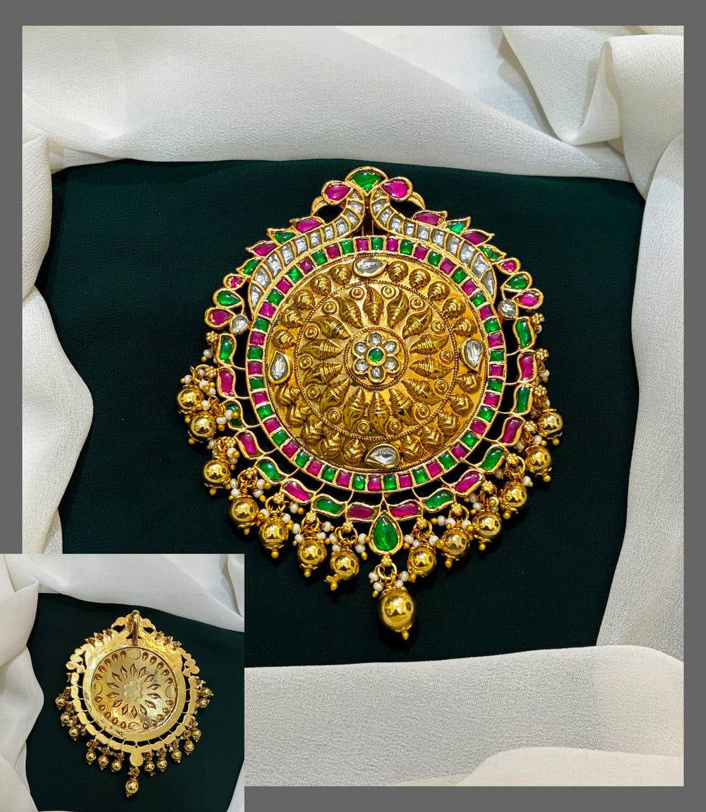 This Nakshi Pendant with Jadau Stones (KP0044) beautifully combines traditional craftsmanship with sparkling elegance. The intricate Nakshi design highlights the detailed artistry, while the embedded Jadau stones add a radiant touch. Perfect for enhancing your ethnic collection, this pendant offers a timeless charm that complements any occasion with grace and style.