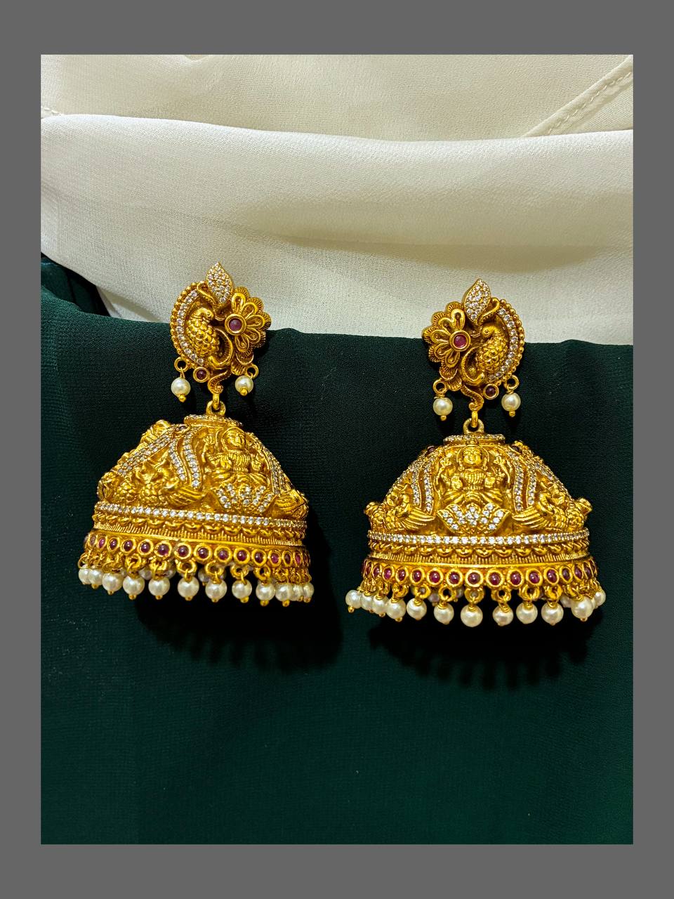 Exquisitely crafted Nakshi Temple Jhumki earrings in jumbo size, featuring traditional temple motifs with intricate nakshi work. These statement pieces blend classical South Indian artistry with contemporary wearability, perfect for wedding ceremonies and festive occasions. The detailed craftsmanship highlights the heritage of temple jewelry while offering substantial presence.