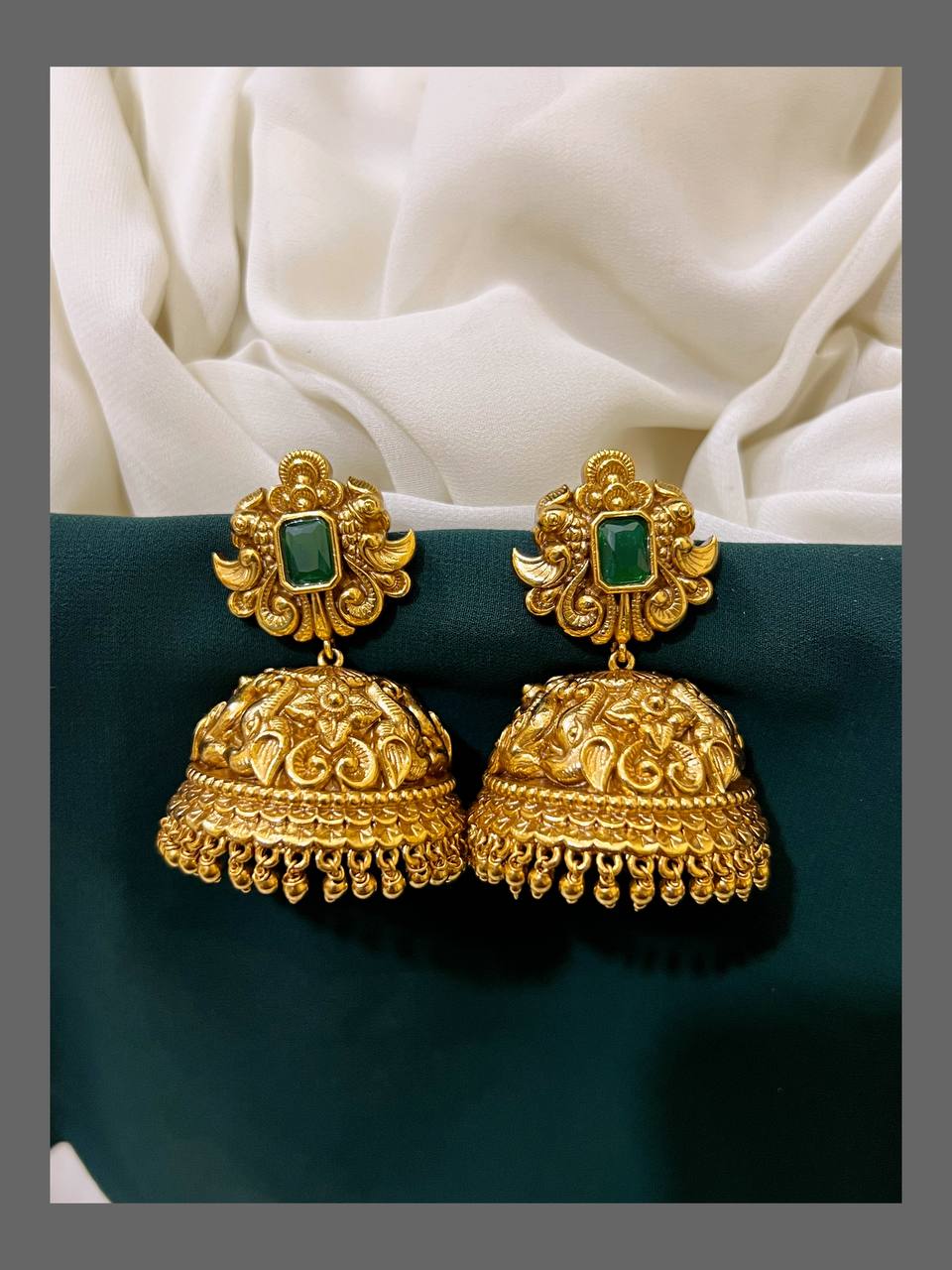 Adorn yourself with these exquisite Nakshi Temple Jhumkis, meticulously crafted with traditional South Indian artistry. These elegant earrings feature intricate temple motifs that celebrate India's rich cultural heritage. Perfect for weddings, festivals, or special occasions, these jhumkis add a touch of timeless elegance to any traditional ensemble.
