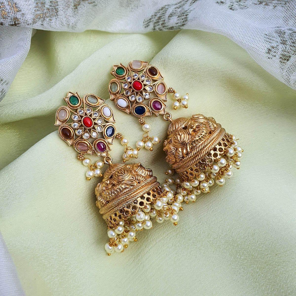 Beautiful Nakshi Jhumkis with navaratna stones.