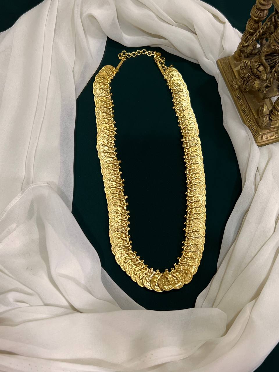 This elegant Peacock and Lakshmi Kasu Haram beautifully blends traditional motifs with intricate craftsmanship. Featuring detailed peacock designs alongside Lakshmi symbols, it brings a touch of cultural richness to your collection. Perfect for festive occasions or special events, this kasu haram adds grace and auspicious charm to your attire. Durable and designed to impress, it makes a meaningful gift or a treasured addition for yourself.