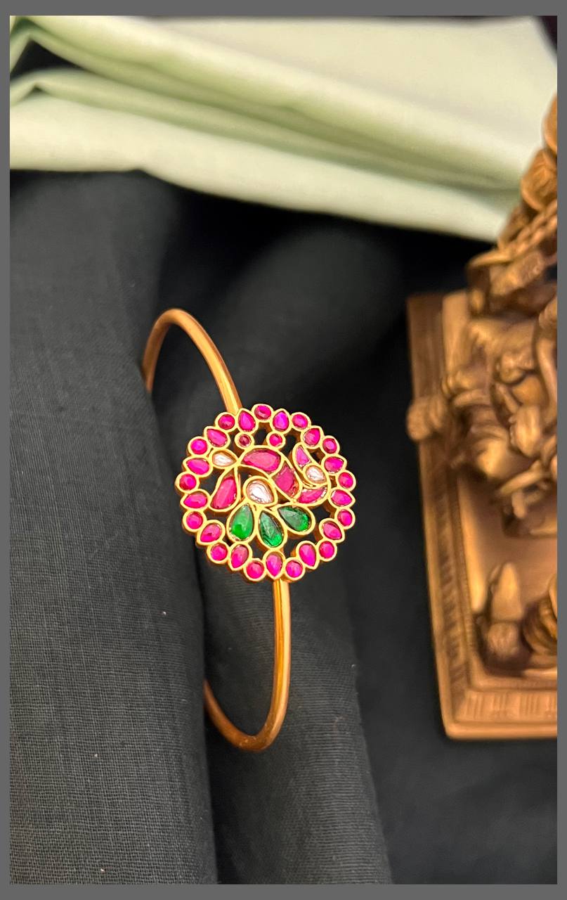 Elevate your wrist with this exquisite Peacock Kundan Bracelet, a masterpiece of traditional Indian craftsmanship. Featuring intricate kundan work adorned with vibrant peacock motifs, this bracelet seamlessly blends heritage artistry with contemporary elegance. The meticulous stone setting and ornamental design make it an ideal choice for festive occasions, weddings, and celebrations. Perfect for those who appreciate fine jewelry that tells a story of skilled artisanship and timeless beauty.
