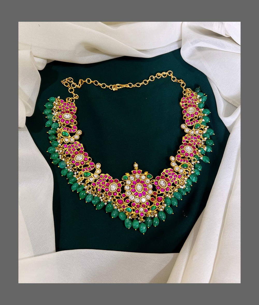 Experience the elegance and beauty of our Peacock Necklace with Flower Pendent in Kundan - KH00150. Made with intricate design and high-quality Kundan stones, this necklace is a perfect addition to your jewelry collection. Its unique peacock motif adds a touch of sophistication to any outfit, making it a must-have for any occasion. Own a piece of timeless art with this stunning necklace.