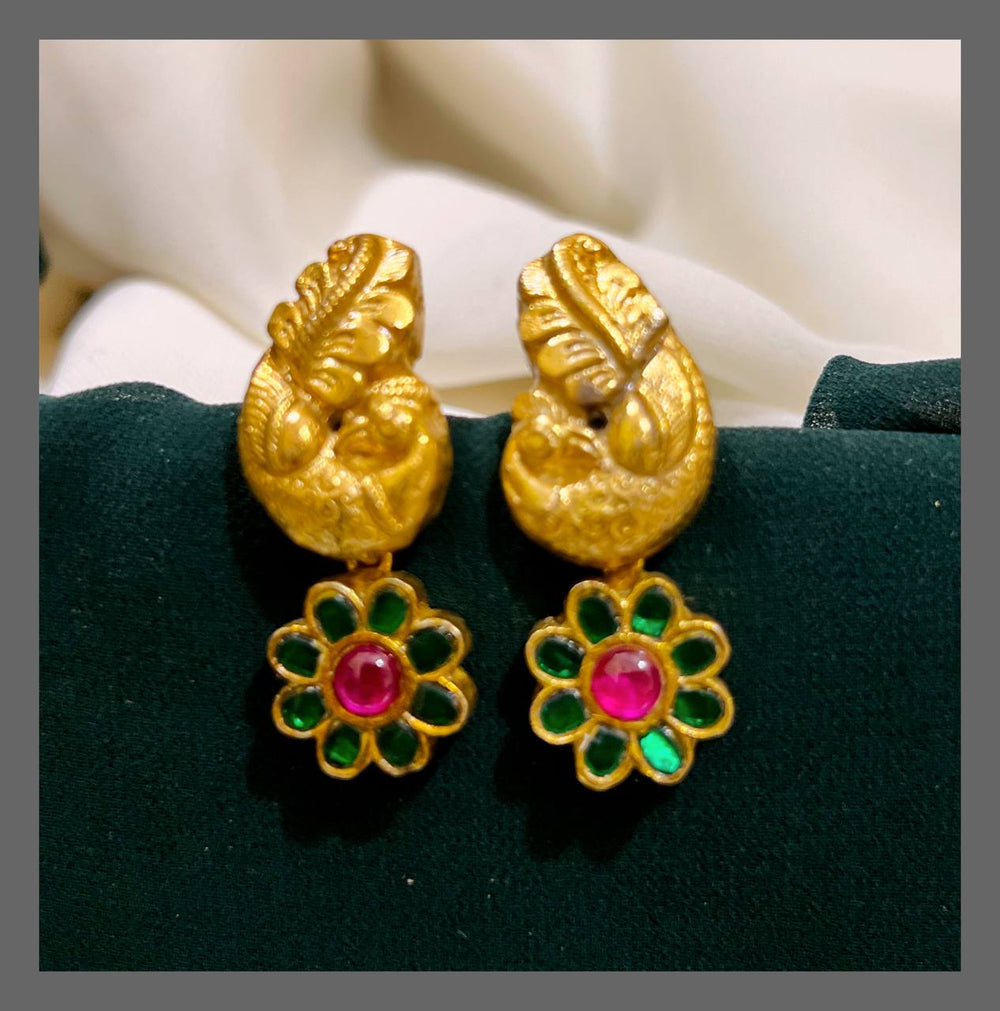 These Peacock Stud Earrings in Kundan showcase exquisite craftsmanship inspired by the elegant peacock motif. The intricately set Kundan stones capture light beautifully, adding a subtle sparkle to your look. Perfect for daily wear or special occasions, these earrings bring a touch of traditional charm to any outfit while offering comfort and durability.