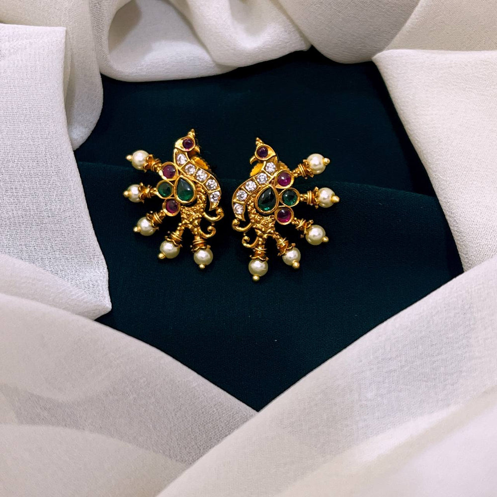 Beautiful Peacock with Body in White Stone ,Gold ,Ruby and Emerald with Pearl as Feather Nakshi Earring, Back push