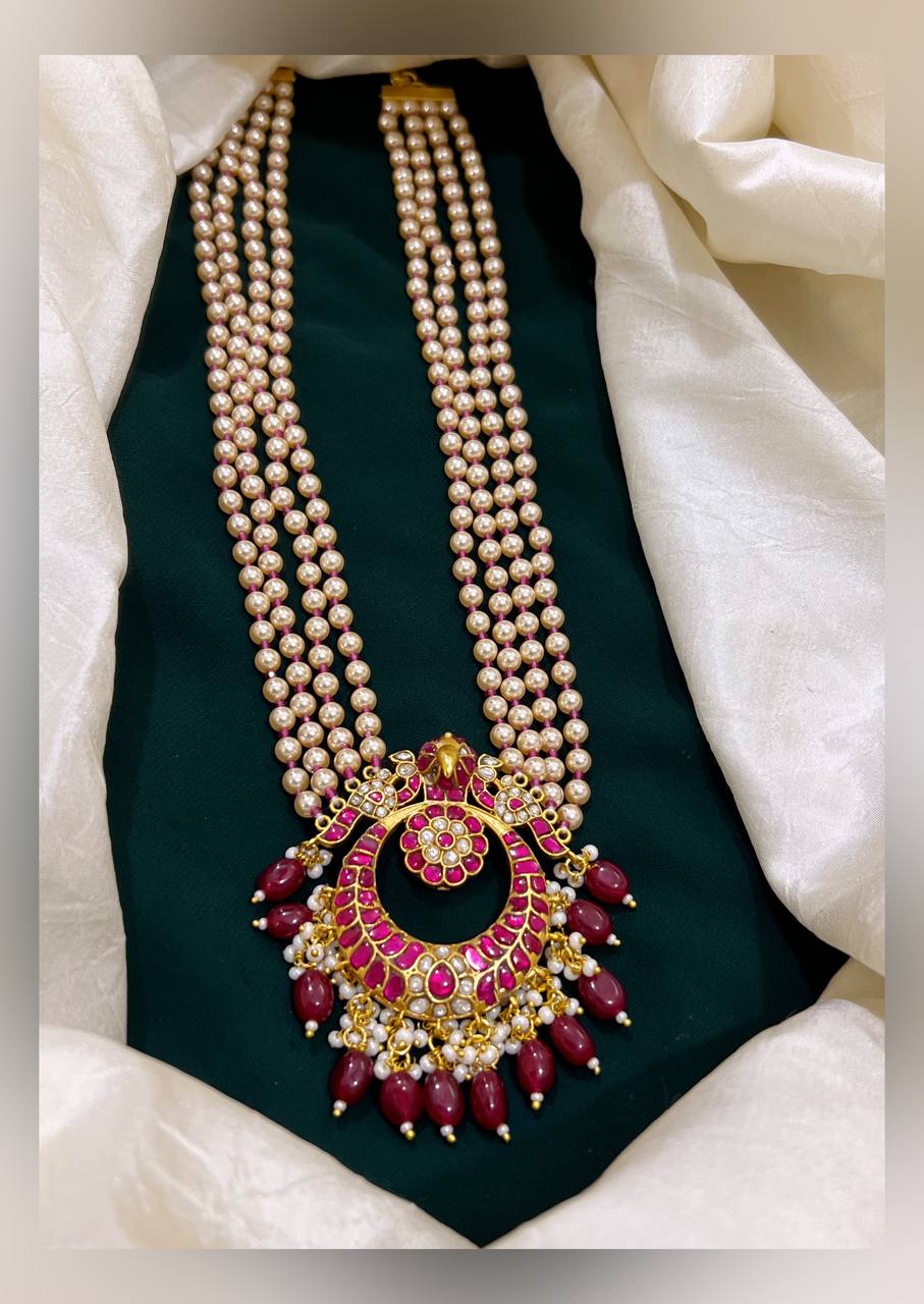 Expertly crafted with delicate pearls and intricate Kundan work, this Pearl Chain with Chandbali Pendent is a true statement piece. The elegant design and traditional craftsmanship make it a timeless addition to any jewelry collection. Perfect for special occasions or gifting, it is sure to add a touch of sophistication to any outfit.