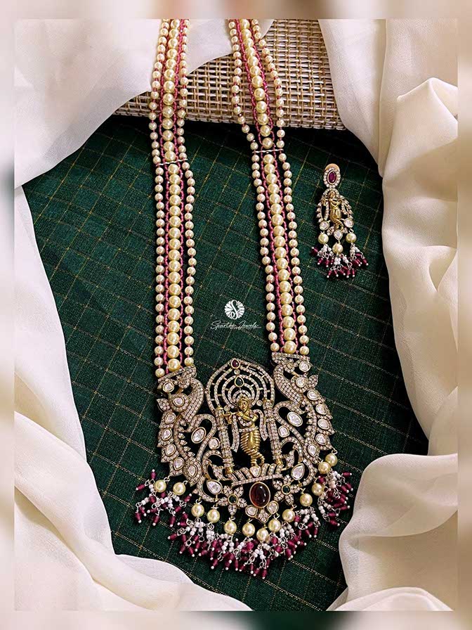 Purple Victorian Krishna Haram With Earrings Features: Color: Purple, White Style: Victoria Krishna Pendant Material: Brass, Beads Earrings: Yes Experience: Lightweight and comfortable to wear Usage: Great for an everyday celebration