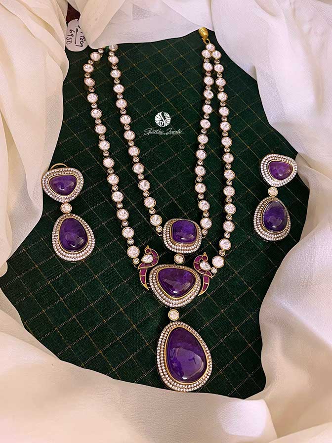 Purple Victorian Peacock Haram With Earrings Features: Color: Purple, White Style: Victoria Pendant Material: Brass, Pearl Earrings: Yes Experience: Lightweight and comfortable to wear Usage: Great for an everyday celebration