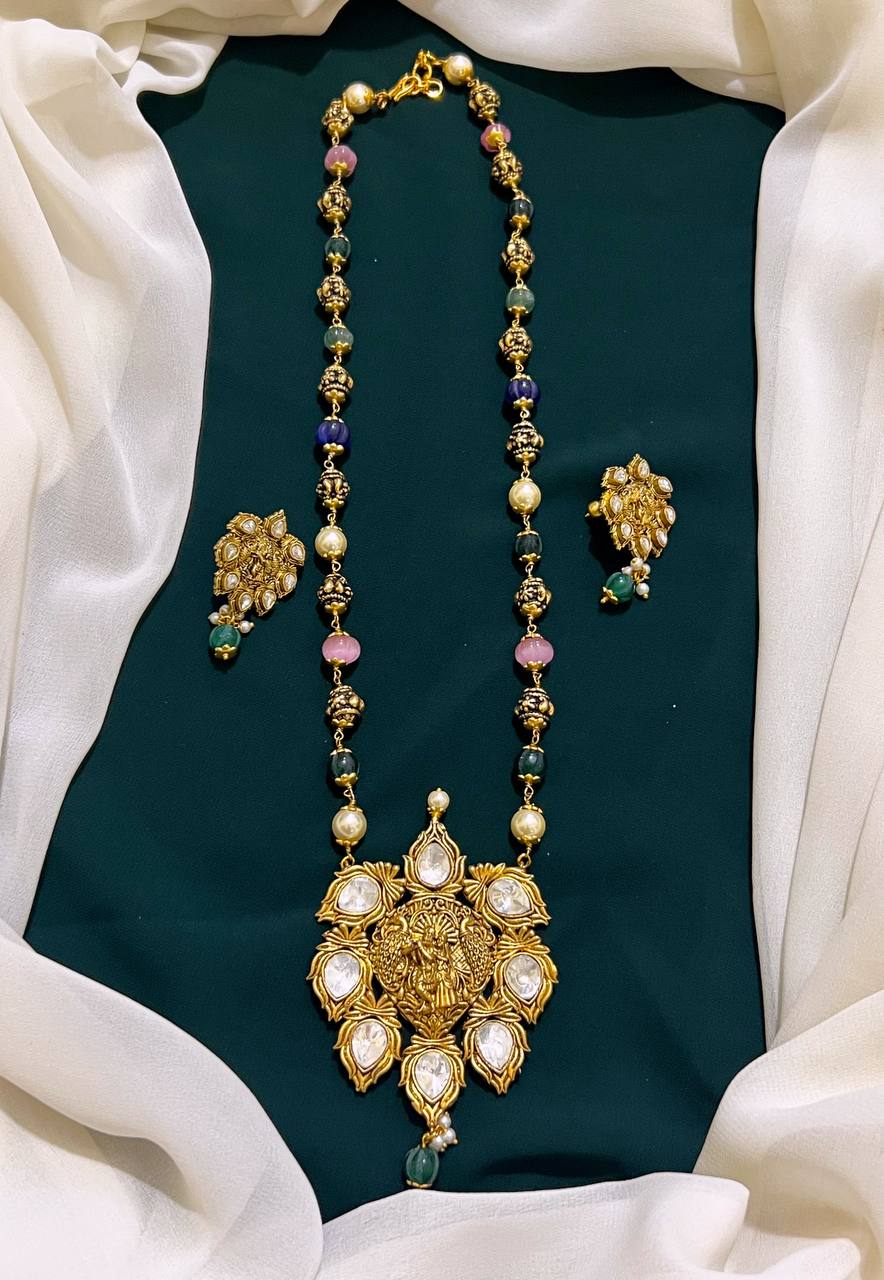 Elevate your accessory collection with this exquisite Radha Krishna pearl Nakshi Haram set with Earrings adorned with intricate craftsmanship.