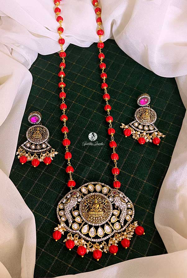 Coral Victorian Lakshmi Haram With Earrings Features: Color: Red Style: Brass Pendant Material: Brass, Pearl Earrings: Yes Experience: Lightweight and comfortable to wear Usage: Great for an everyday celebration