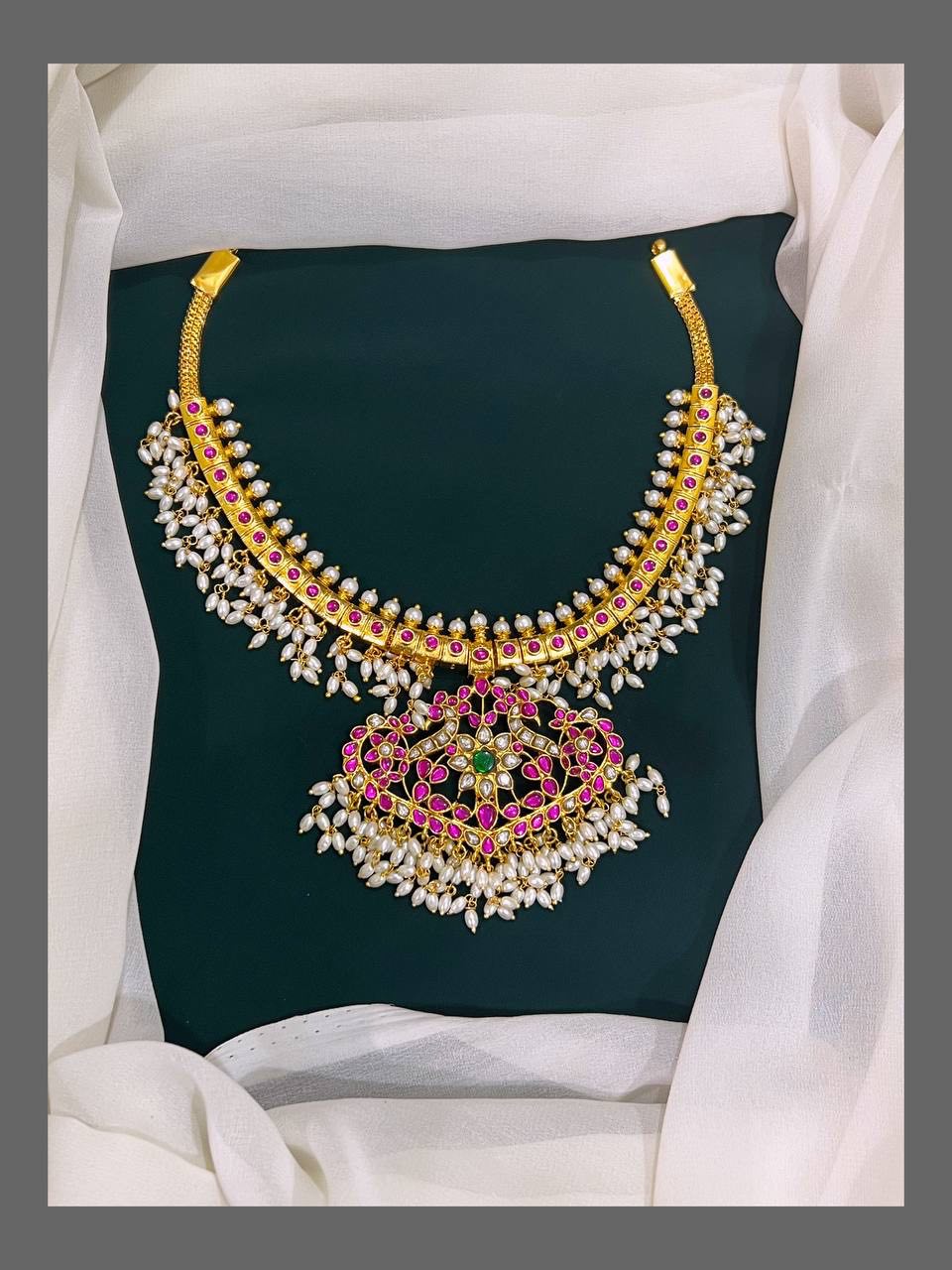 This exquisite necklace features delicate rice pearls and vibrant rubies arranged in a stunning peacock design, crafted with traditional Kundan artistry. Perfect for adding a touch of elegance to any outfit, it combines timeless beauty with intricate craftsmanship to make you feel special on every occasion.