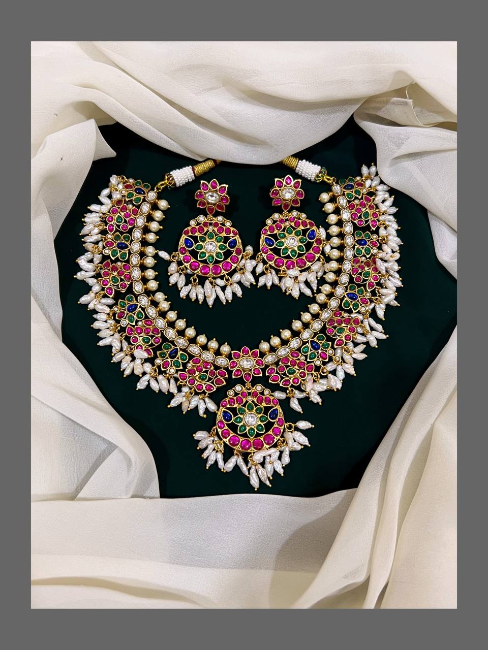This Rice Pearl Multi Kundan Necklace - KN00195 offers an elegant and timeless design featuring a variety of beautiful pearls and intricate kundan stones. With its delicate craftsmanship and versatile style, it is a perfect addition to any formal attire. Enhance your look with the grace and charm of this exquisite necklace.