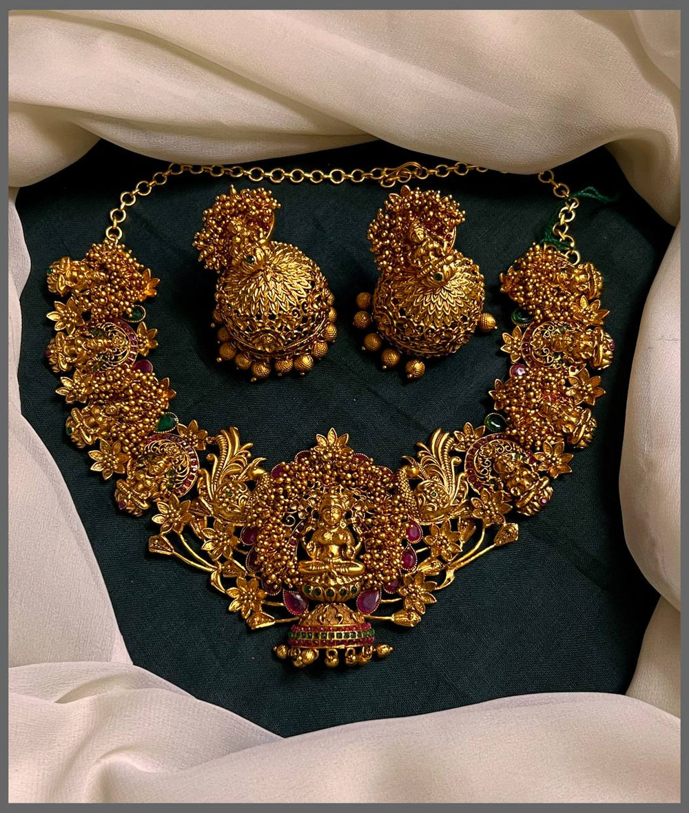 Celebrate divine elegance with this exquisite Lakshmi necklace, crafted in traditional Nakshi technique. This stunning piece features intricate detailing that captures the essence of prosperity and grace. The rich, ornate design makes it perfect for special occasions, festivals, or adding a touch of spiritual beauty to your everyday collection. A timeless investment that honors both artistry and tradition.