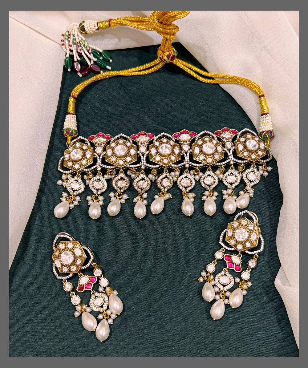 Elevate your traditional ensemble with this exquisite Rich White Chokar, crafted with intricate Kundan work. This stunning neckpiece features authentic kundan stones set in a rich white metal base, creating a timeless piece perfect for weddings, festivals, and special occasions. The delicate craftsmanship showcases traditional artistry while the elegant white finish complements any bridal or festive attire. A versatile addition to your jewelry collection that brings sophistication and cultural grace to your look.