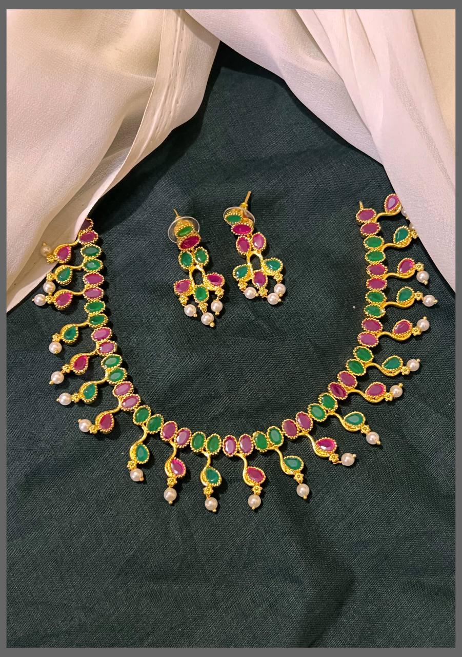 Elevate your traditional collection with this stunning Ruby and Emerald Stone Necklace, crafted in exquisite Nakshi work. This piece beautifully combines the deep crimson allure of rubies with the lush green brilliance of emeralds, set against intricate handcrafted detailing. Perfect for festive occasions, weddings, or adding timeless elegance to your everyday wear, this necklace celebrates the finest in heritage jewelry design. Each stone is carefully selected to ensure vibrant color and lasting beauty, making it a cherished addition to your jewelry wardrobe.