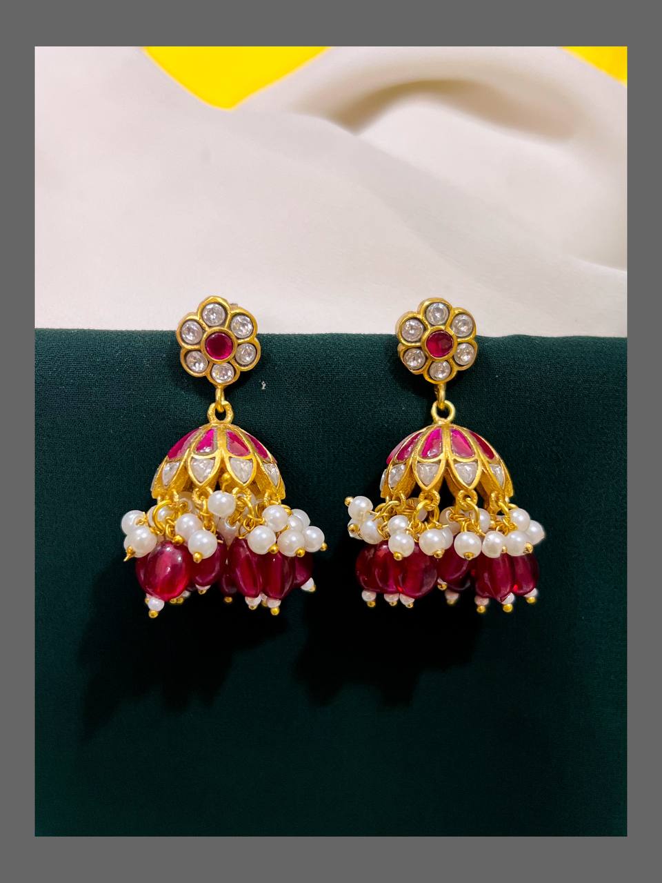 Elevate your traditional attire with these Ruby and White Flower Jhumkis crafted in exquisite Kundan work. The vibrant ruby stones paired with delicate white accents create a charming floral design, perfect for adding a touch of elegance to any festive or special occasion. Lightweight and comfortable, these jhumkis blend classic craftsmanship with timeless beauty to complement your look effortlessly.