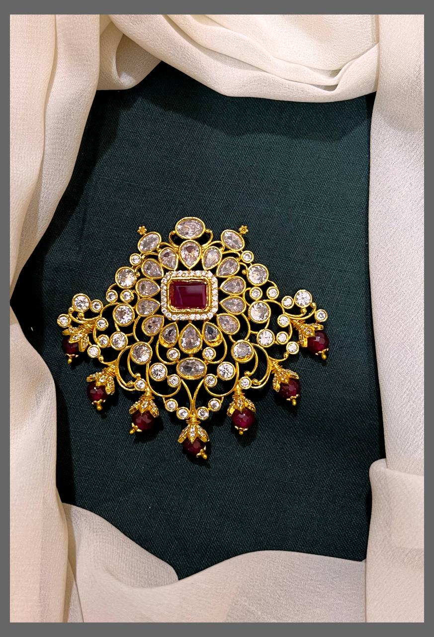 Elevate your jewelry collection with this stunning Ruby and White Stone Pendant in Nakshi craftsmanship. The rich, deep red ruby is beautifully complemented by pristine white stones, creating a timeless contrast that catches the light beautifully. Nakshi work brings intricate traditional detailing to this piece, making it perfect for both everyday elegance and special occasions. Whether you're dressing up for a celebration or adding a touch of sophistication to your daily look, this pendant serves as a versatile accessory that celebrates classic Indian jewelry artistry. A cherished addition to any jewelry lover's collection.