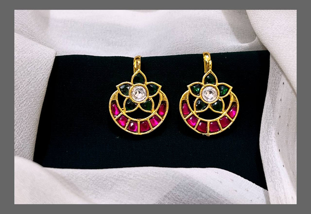 The Ruby Chand Bali with Flower Bugadi - BU0081 is a beautifully crafted piece that combines the timeless elegance of ruby stones with intricate floral detailing. This jewelry adds a touch of traditional charm to any outfit, making it perfect for both special occasions and everyday wear.