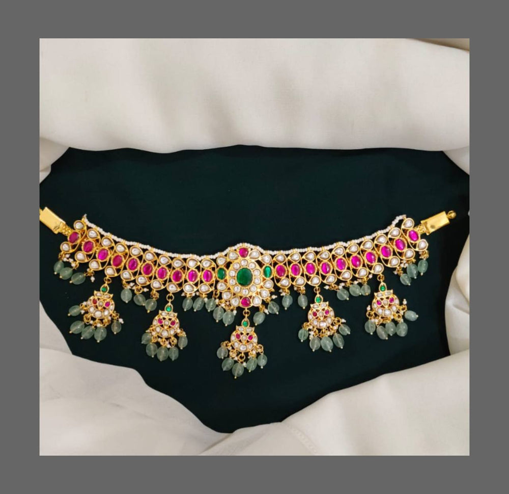 Expertly crafted with Kundan stones, this Ruby Choker boasts a Chandbali hanging for added elegance. The traditional design is perfect for special occasions and adds a touch of sophistication to any outfit. Make a statement with this exquisite piece, KN00203.
