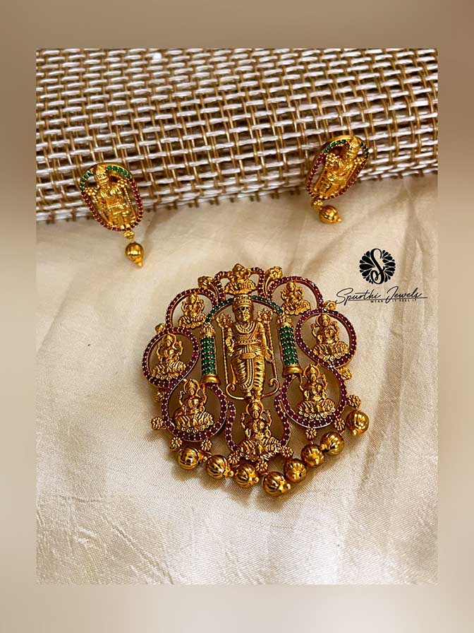 Ruby Color Laxmi Pendant with Earrings Features: Color: Golden Style: Laxmi Pendant Material: Brass Earrings: Yes Experience: Lightweight and comfortable to wear Usage: Great for an everyday celebration
