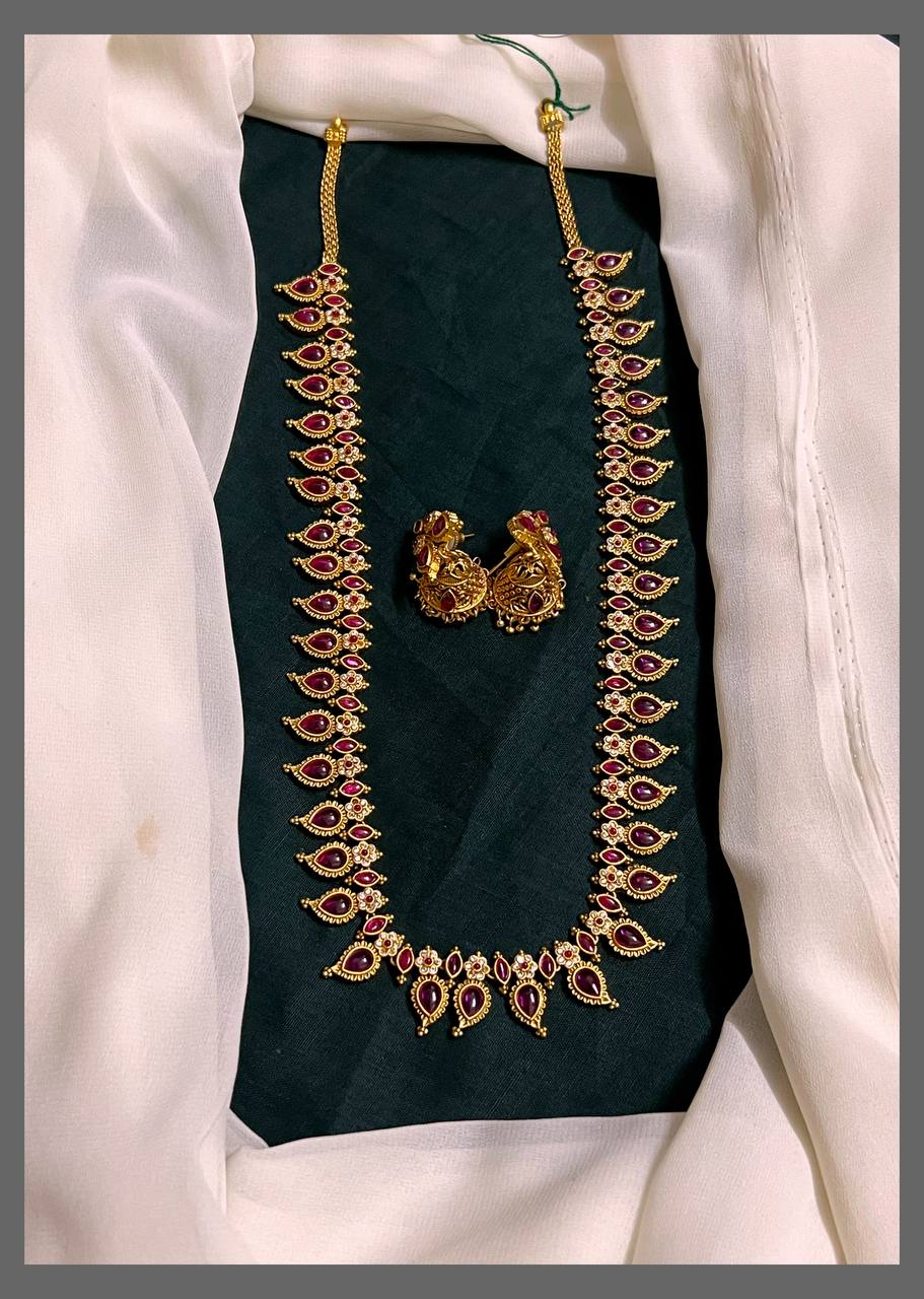 Embrace timeless elegance with this exquisite Ruby Dew Drops Nakshi Haram. Crafted with meticulous attention to detail, this traditional piece features lustrous ruby stones set in intricate nakshi work that celebrates authentic craftsmanship. The delicate dew drop design adds a touch of sophistication, making it perfect for weddings, festivals, and special occasions. Each stone is carefully selected to ensure radiance and beauty. This heirloom-worthy necklace combines classical artistry with enduring charm, allowing you to express your refined taste while honoring traditional jewelry heritage.