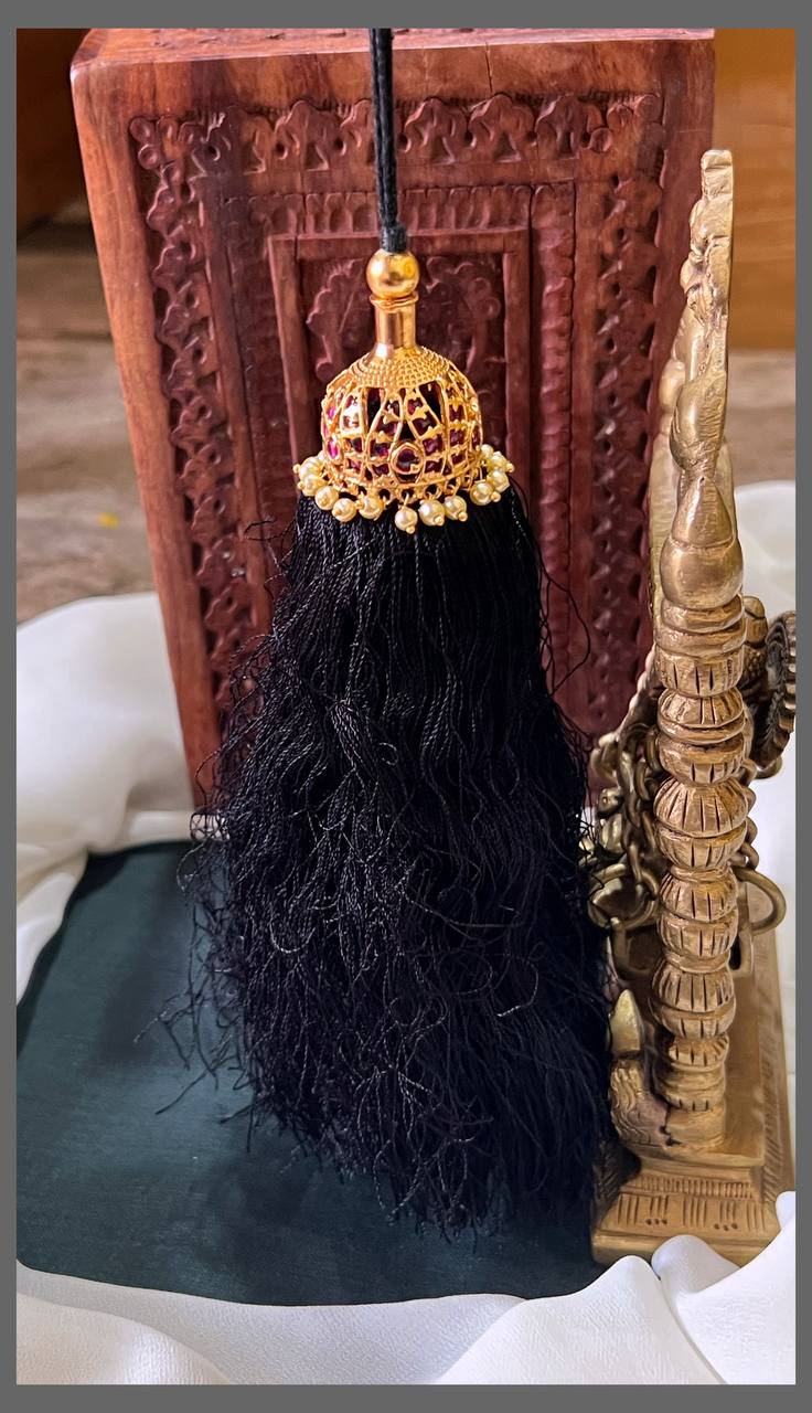 Elevate your traditional ensemble with this exquisite Ruby Flower Jada Kuchu, meticulously crafted in authentic Nakshi technique. The intricate floral design features vibrant ruby stones that catch light beautifully, adding a touch of sophistication to your hair. Perfect for weddings, festivals, and special occasions, this piece combines classical artistry with timeless elegance. The detailed Nakshi work showcases superior craftsmanship, making it an investment in heritage jewelry that complements both contemporary and traditional styling.