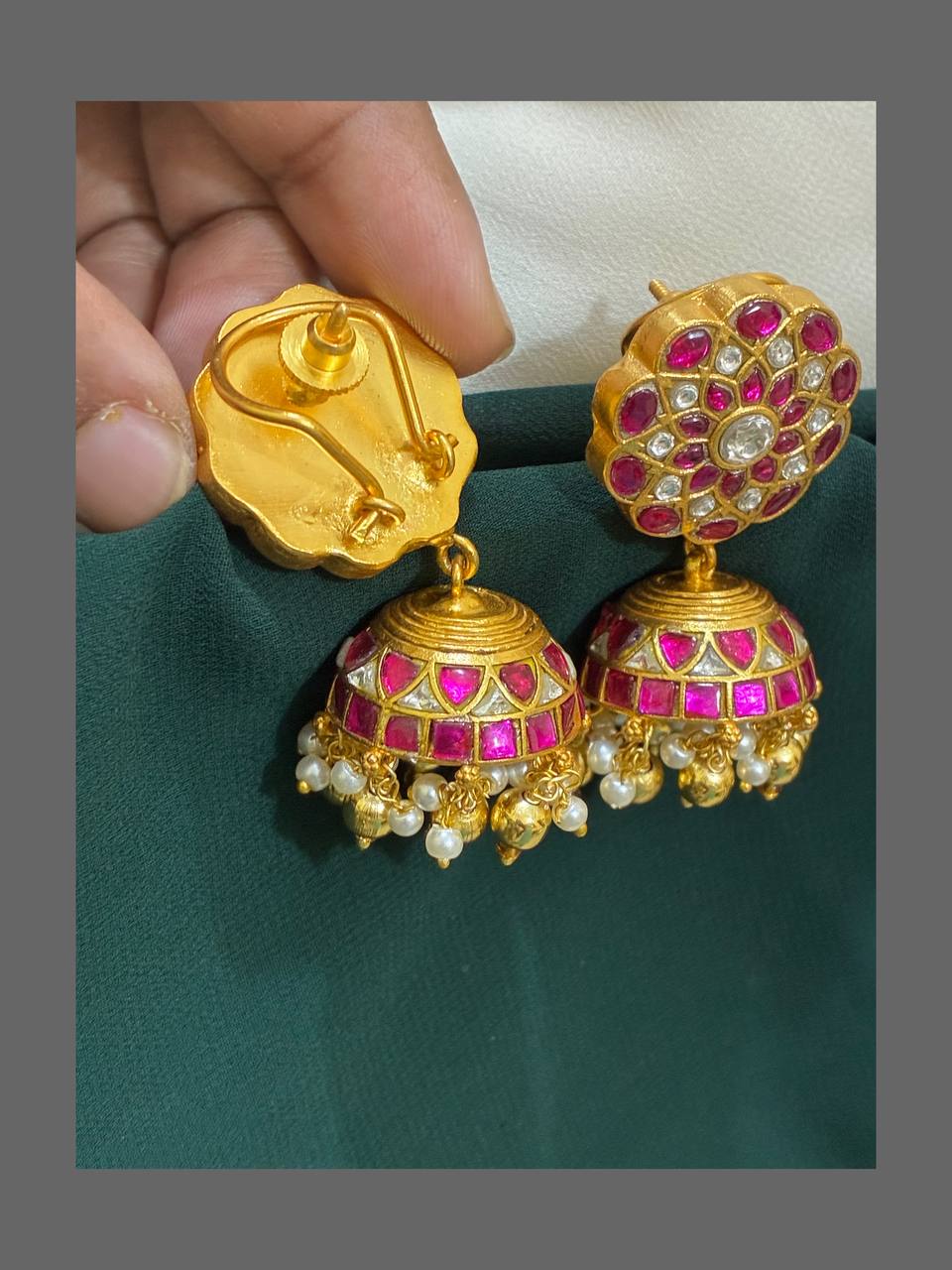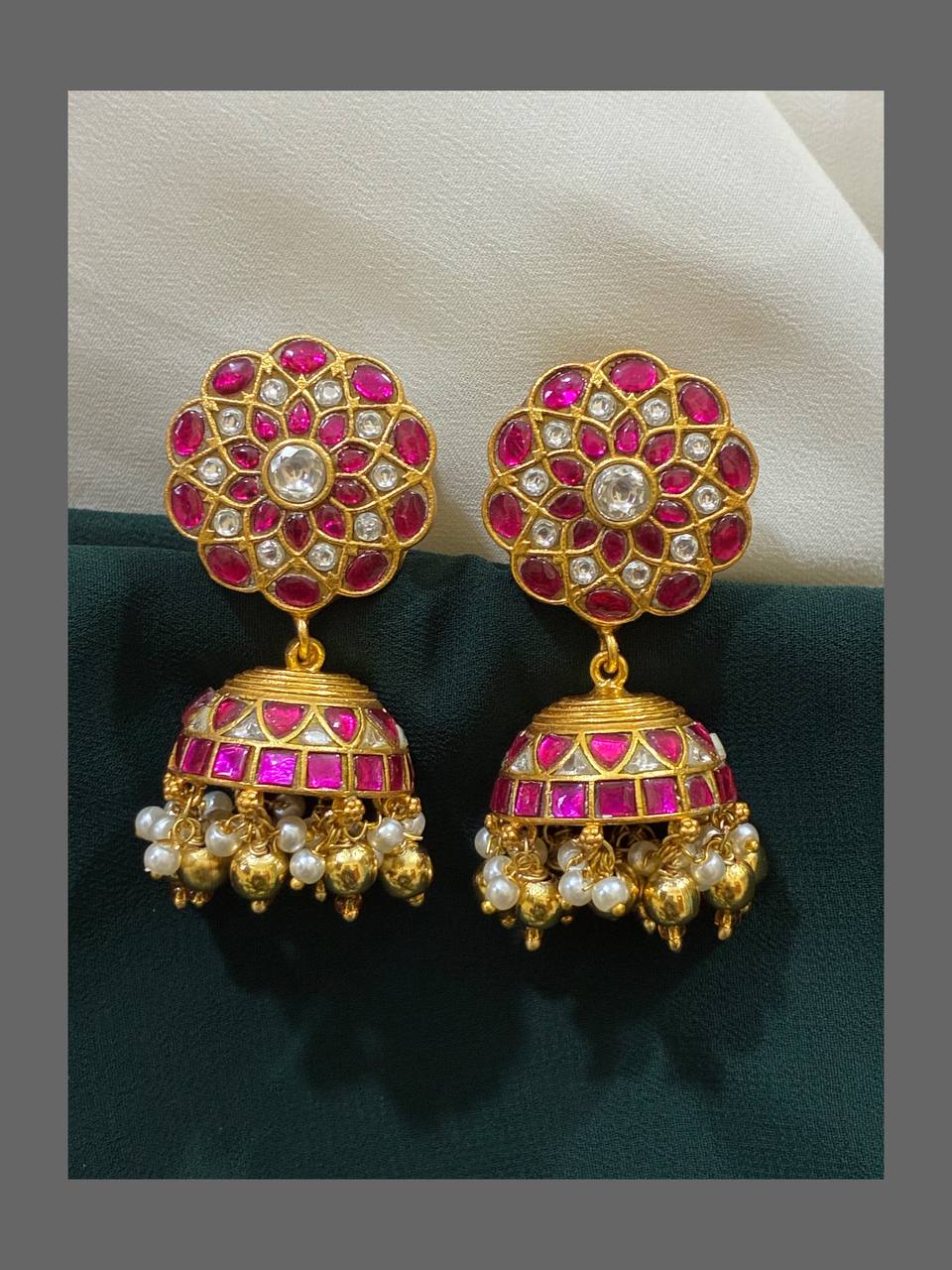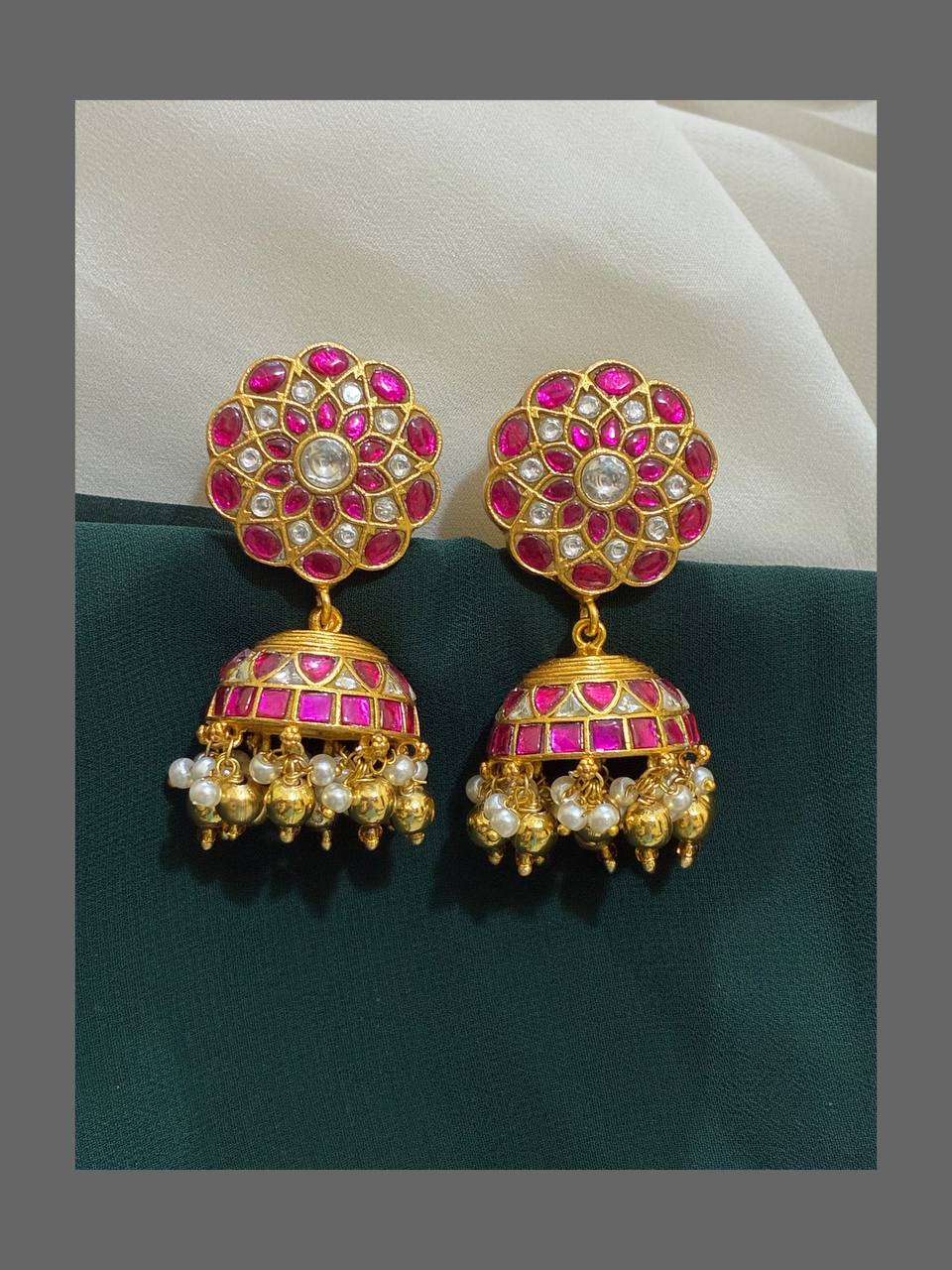 Bring a touch of elegance to your look with our Ruby Flower Jimikki in Kundan - KE00183. This stunning accessory features a unique design of ruby flowers and sparkling Kundan stones, adding the perfect amount of shimmer to any outfit. Elevate your style with this handcrafted piece.