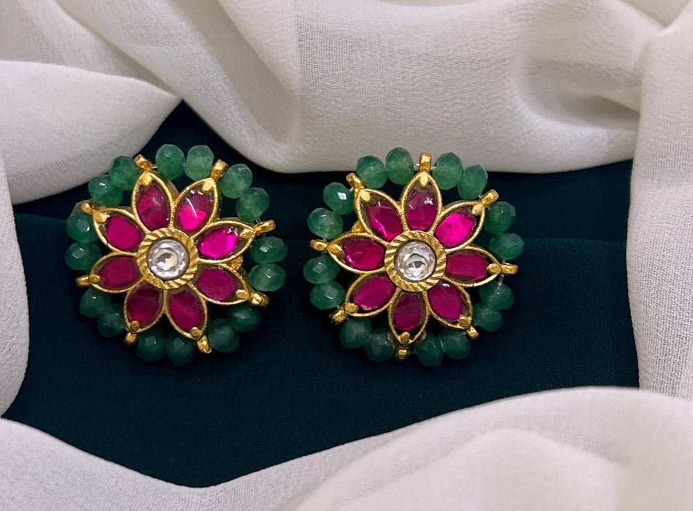 This elegant Kundan earring, KE00172, features a stunning ruby flower and a striking green pearl that adds a touch of sophistication to any outfit. With expert craftsmanship and the highest quality materials, this earring is sure to elevate your style. Add it to your collection for a timeless and unique accessory.
