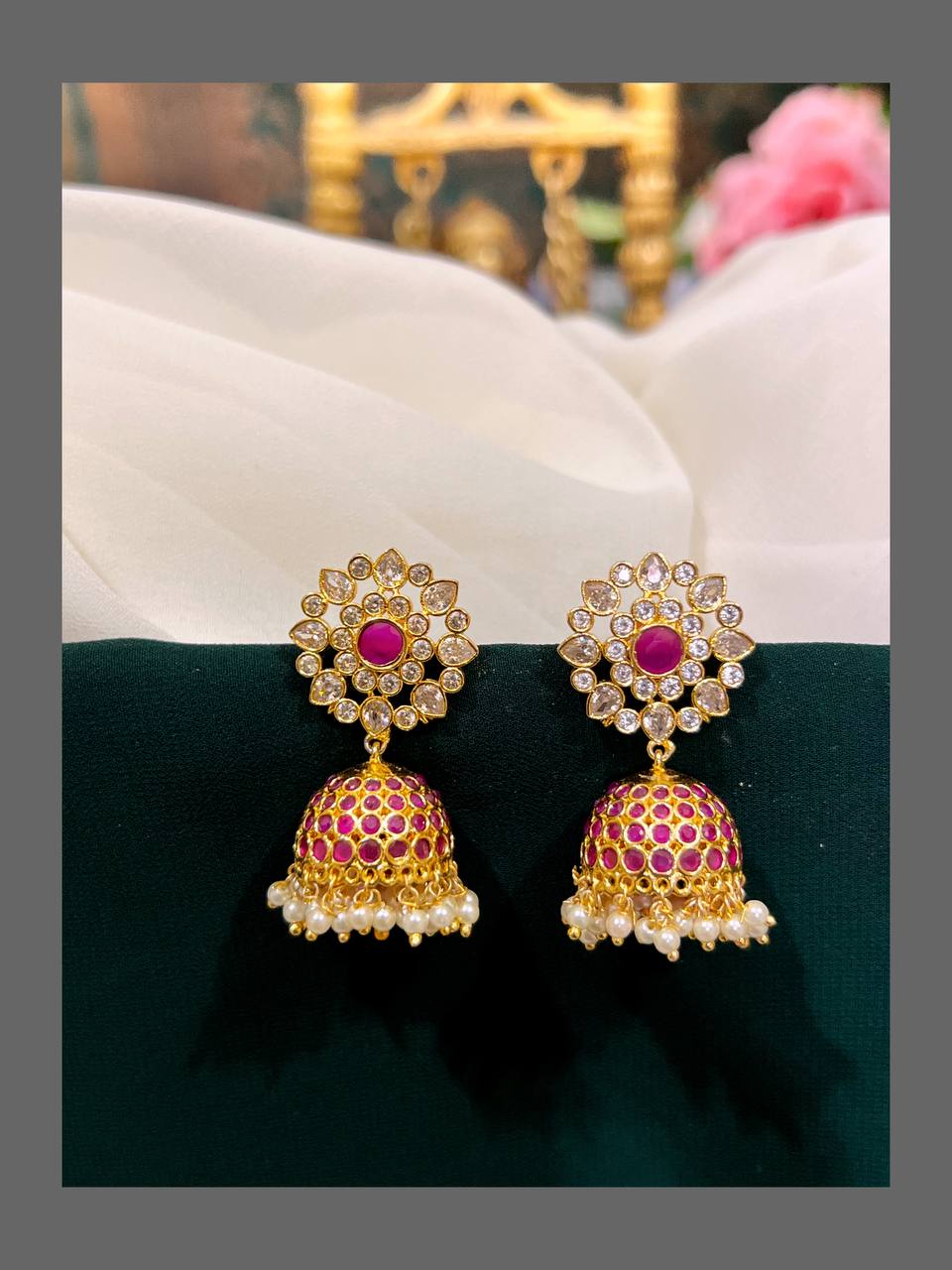 These Ruby Jhumki Earrings in Nakshi design blend traditional elegance with vibrant ruby accents. Crafted to enhance your festive and special occasion looks, they offer a timeless charm that complements various styles. Comfortable to wear and beautifully detailed, these earrings make a thoughtful addition to your jewelry collection.