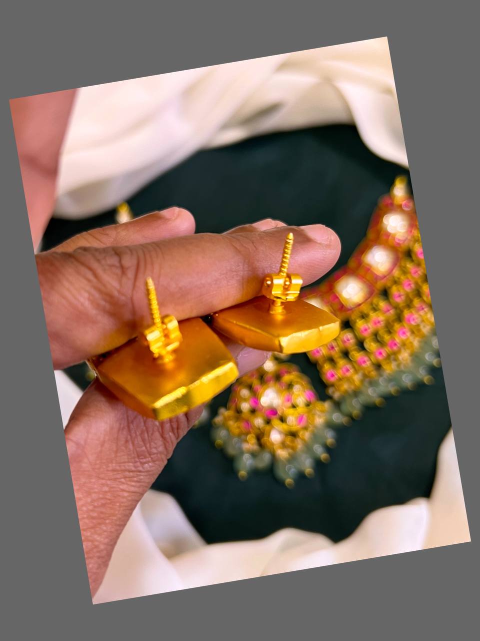Elevate your festive elegance with this stunning Ruby Kundan Necklace, a timeless piece that beautifully combines traditional craftsmanship with sophisticated design. Featuring rich ruby stones set in intricate kundan work, complemented by lustrous emerald pearls, this necklace brings warmth and radiance to any occasion. The exquisite detailing showcases the artistry of fine jewelry making, making it perfect for weddings, celebrations, or special moments. A versatile treasure that pairs effortlessly with both traditional and contemporary attire, this necklace is designed to make you feel confident and cherished.