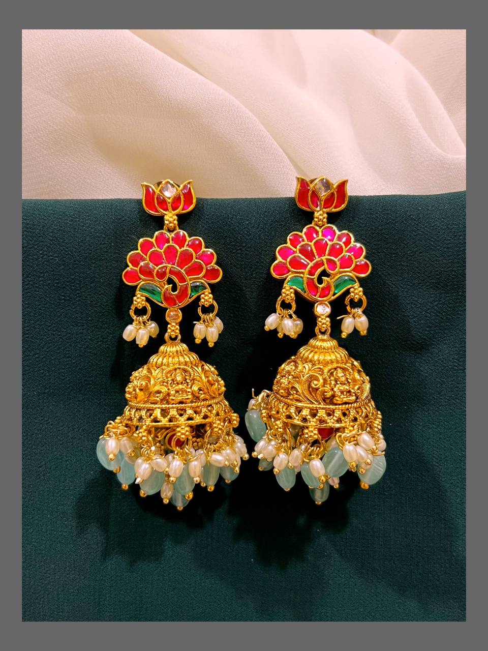 Embrace elegance with the Ruby Lotus with Peacock Jhumki in Kundan. Crafted carefully to highlight the vibrant rubies and intricate peacock design, these earrings add a traditional touch to any outfit. Perfect for festive occasions or special moments, they combine timeless craftsmanship with a graceful flair, making you feel confident and radiant every time you wear them.