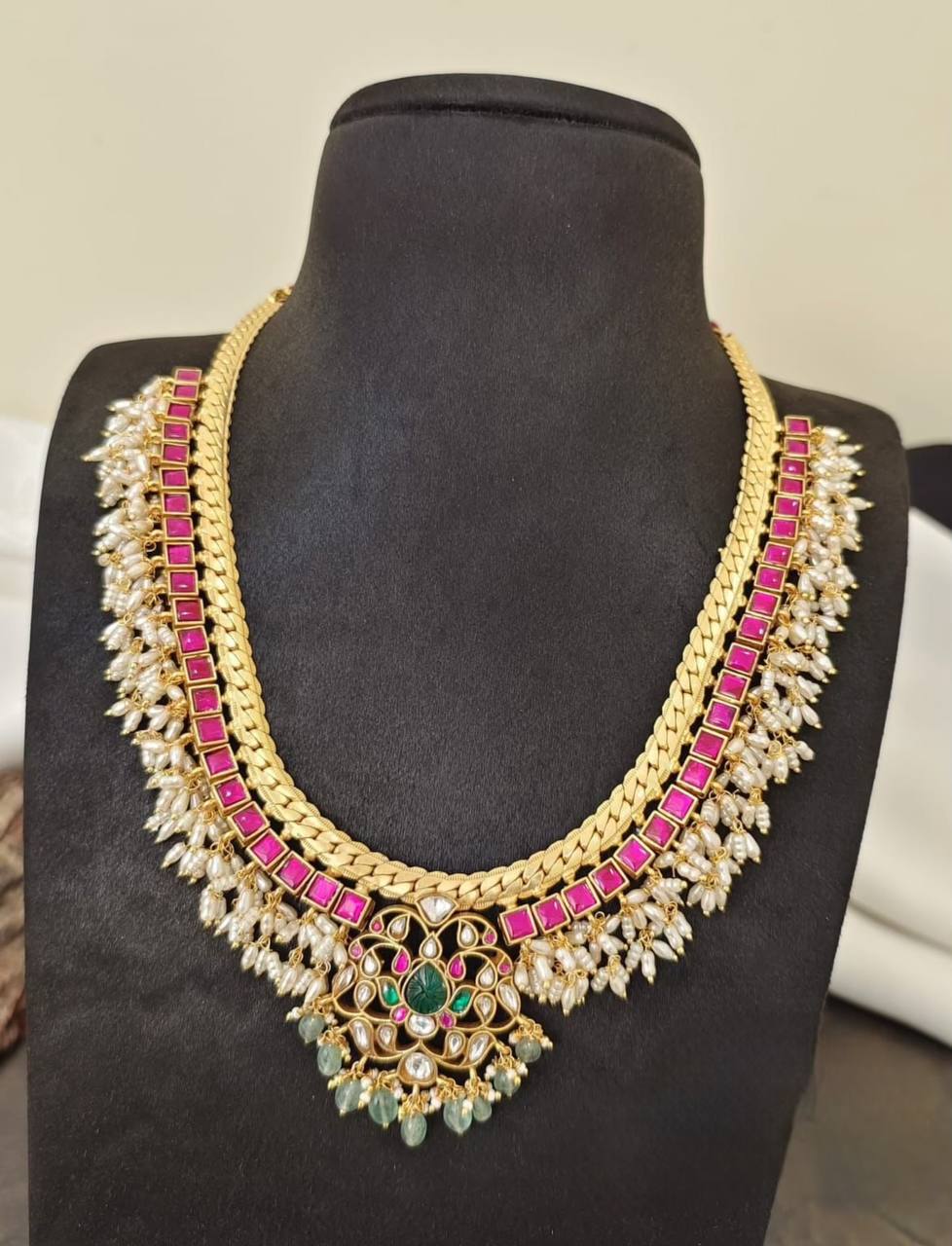 Elevate your accessory collection with this exquisite Ruby Rice Pearl Flower in Jadau Haram adorned with intricate JADAV KUNDAN workmanship. This stunning piece combines elegance and tradition, making it a perfect addition to any outfit, whether for a special occasion or everyday wear.