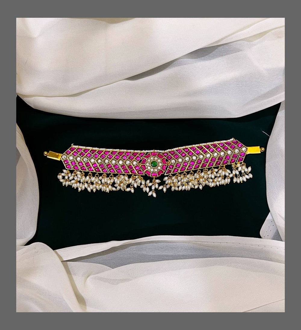 Elevate your elegance with this Ruby and Rice Pearl Choker crafted in traditional Kundan style. The rich red rubies paired with delicate rice pearls create a timeless look that complements any outfit. Perfect for special occasions, this choker adds a touch of classic charm while ensuring comfort and style throughout your day.