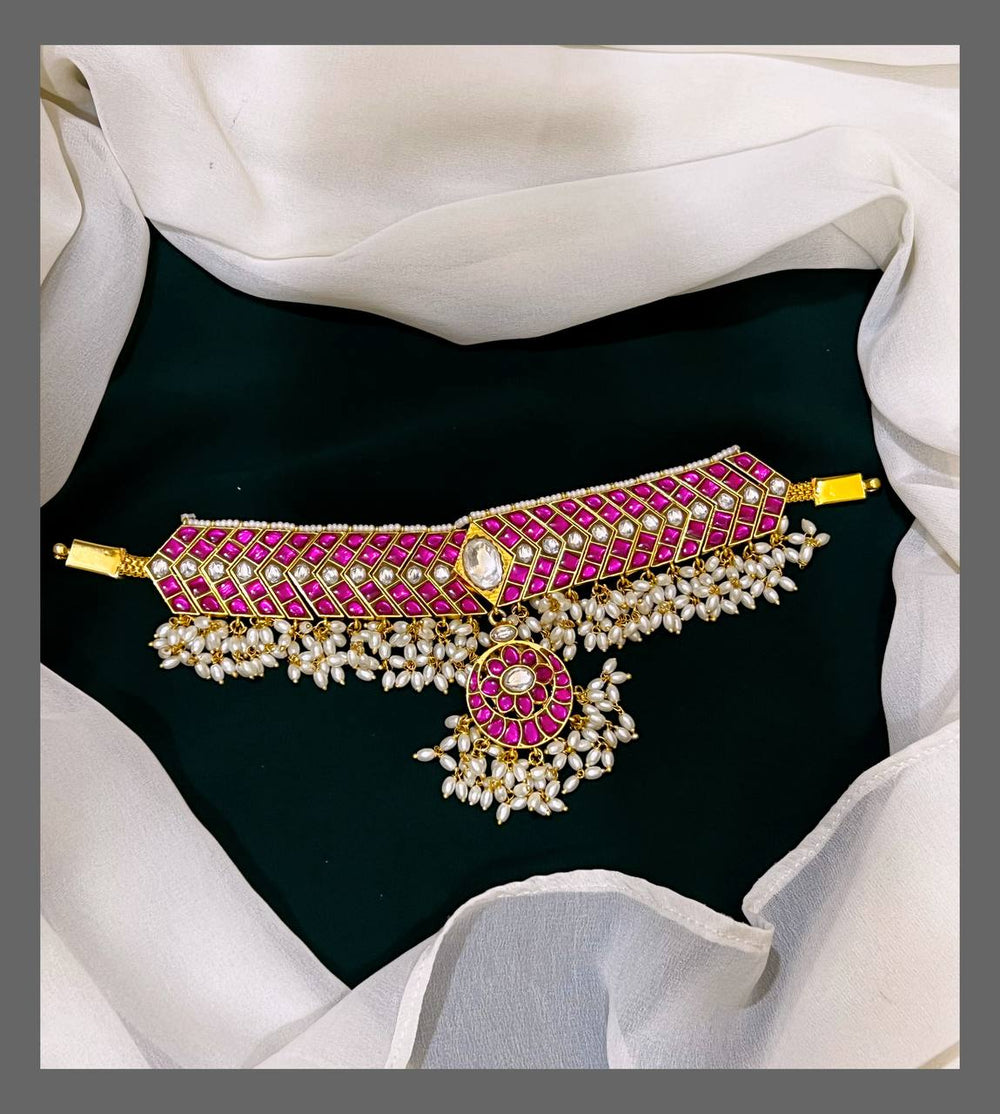 This exquisite Ruby with Rice Pearl Pendant in Kundan craftsmanship beautifully blends traditional elegance with timeless charm. The vibrant ruby centerpiece is complemented by delicate rice pearls, creating a graceful accessory that enhances any outfit. Perfect for special occasions or daily wear, this pendant adds a touch of sophistication and cultural richness to your jewelry collection.
